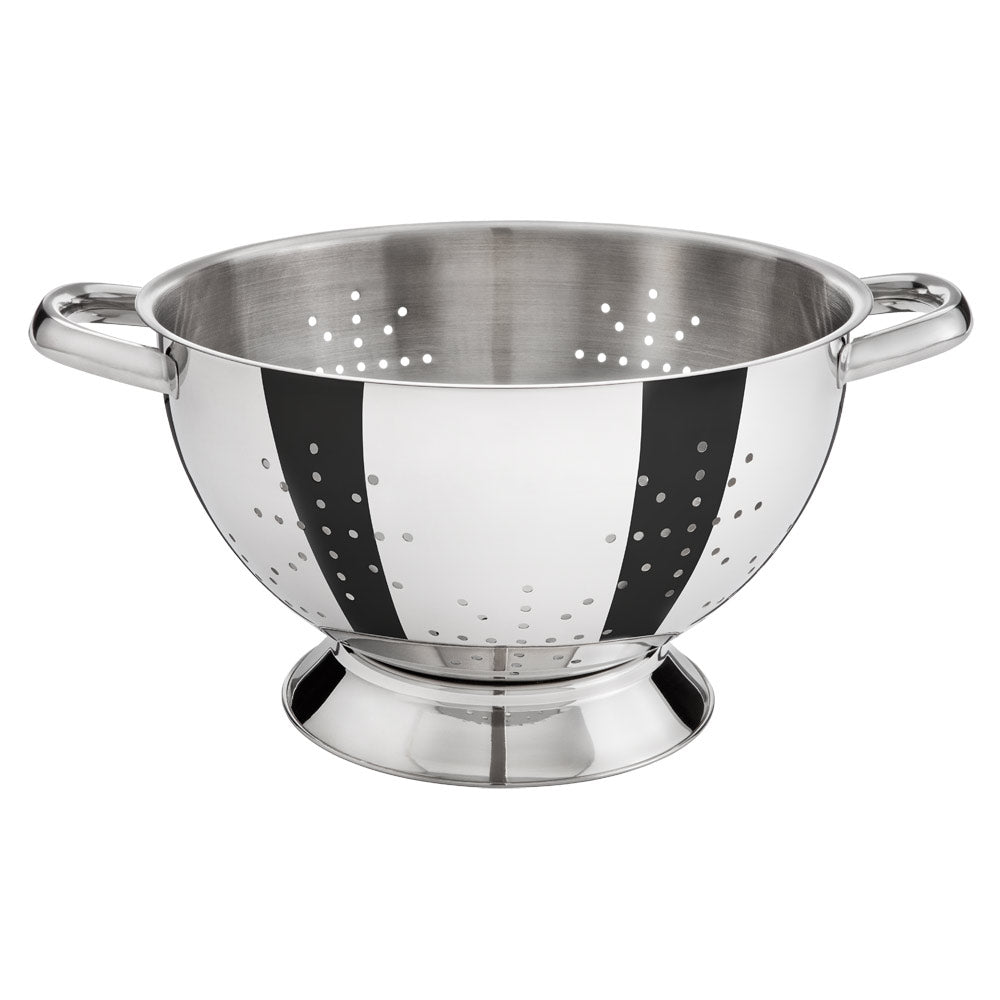 Mittelschwere, spülmaschinengeeignete Qualität aus rostfreiem Edelstahl. Mit 4 mm Seiten- und Bodenlochung, angeschweißten Hohlgriffen und Fuß.