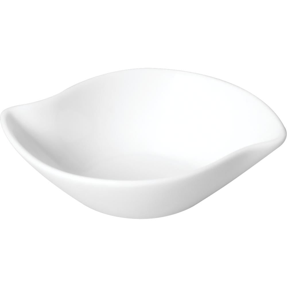 Flaches Schälchen in Wellenform aus spülmaschinenfestem, stapelbarem, hochweißem Hartporzellan. Größe 8,7 x 6,5 x 2,5 cm - Inhalt 40 ml.
