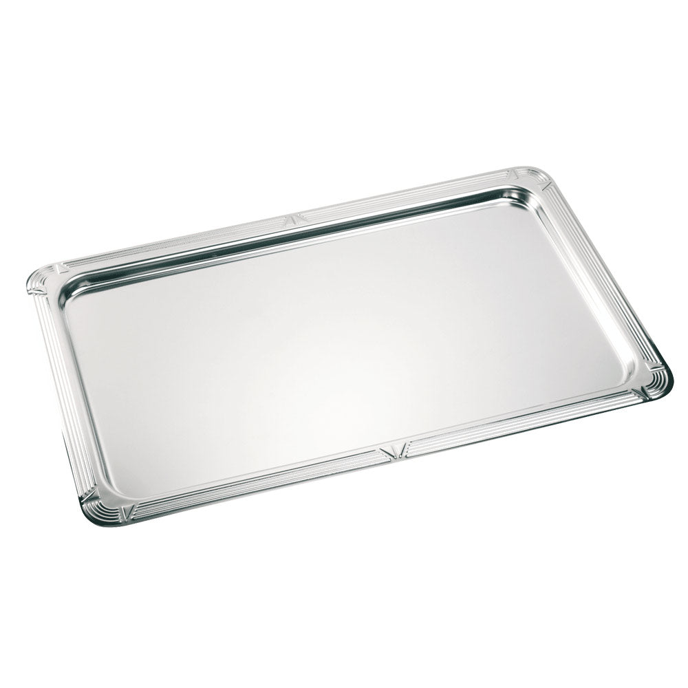 Das rechteckige Serviertablett Art Dekor in GN 1/1 hat eine Größe von 53 x 32,5 cm. Es ist stabil und besteht aus rostfreiem Edelstahl 18/0-1,0 mm. Deswegen ist es auch besonders robust und langlebig. Außerdem ist das Serviertablett spülmaschinengeeignet.