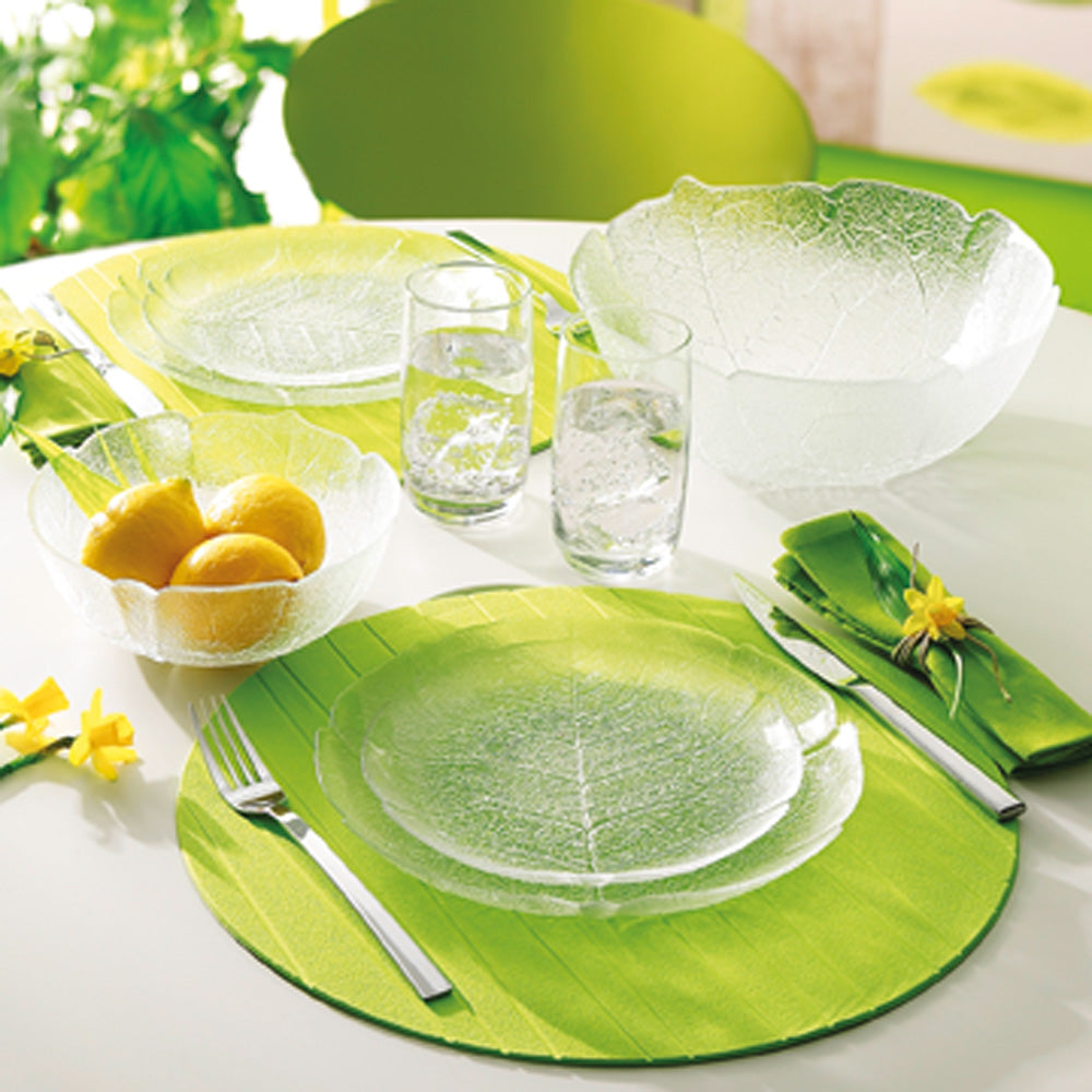 Klassische Tellerserie mit filigraner Blattstruktur. Aus stoßfestem, gehärtetem Glas, mikrowellen- und spülmaschinenfest.