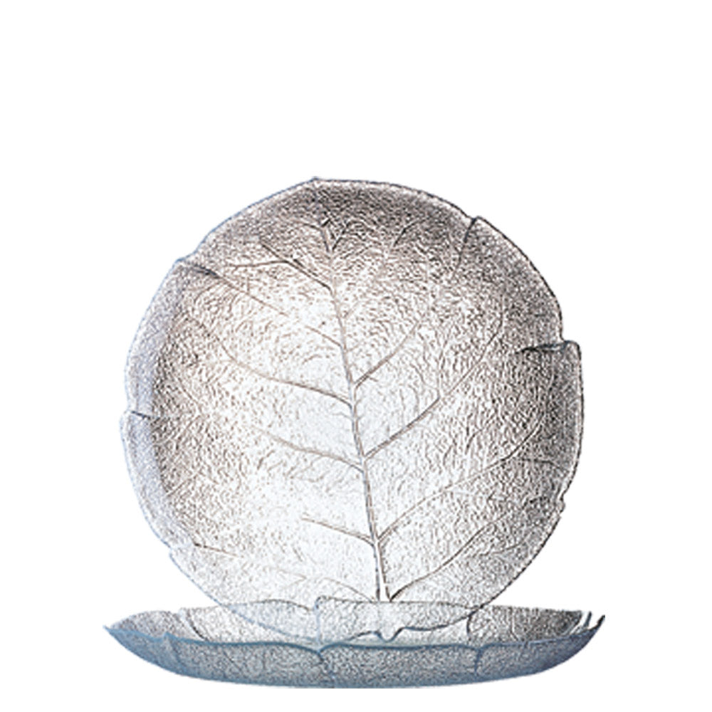 Klassische Tellerserie mit filigraner Blattstruktur. Aus stoßfestem, gehärtetem Glas, mikrowellen- und spülmaschinenfest.