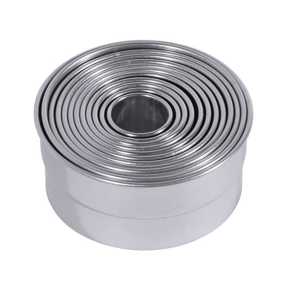 Runde, glatte Ausstechformen aus Edelstahl. 12-teiliges Set mit Formen, die einen Durchmesser zwischen 2,5 und 10,5 cm haben. Alle Formen haben eine Höhe von 5 cm.