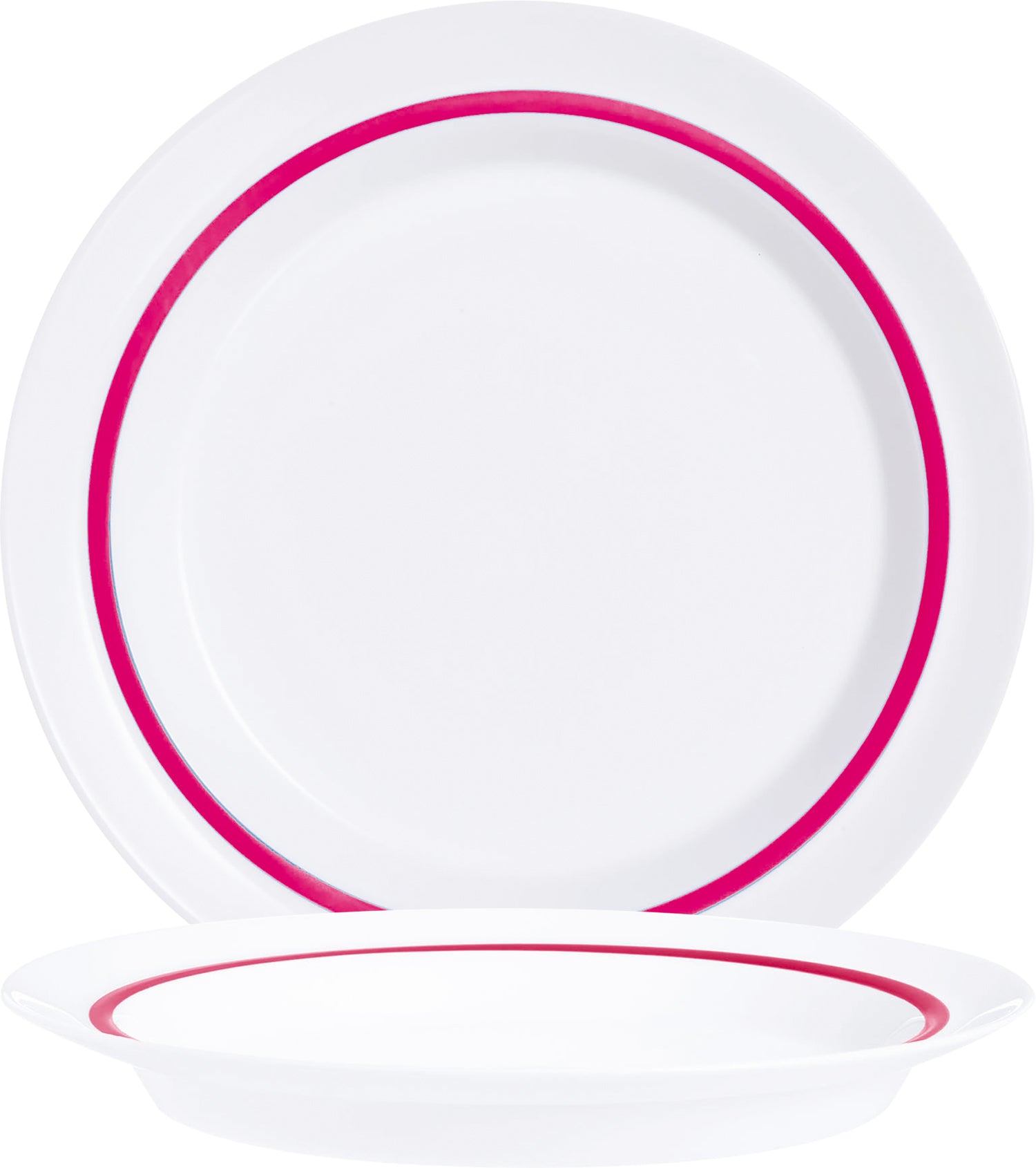 - Opalglas-Teller mit ausgeprägter Vertiefung, planen Boden und farbiger Linie als Orientierungshilfe