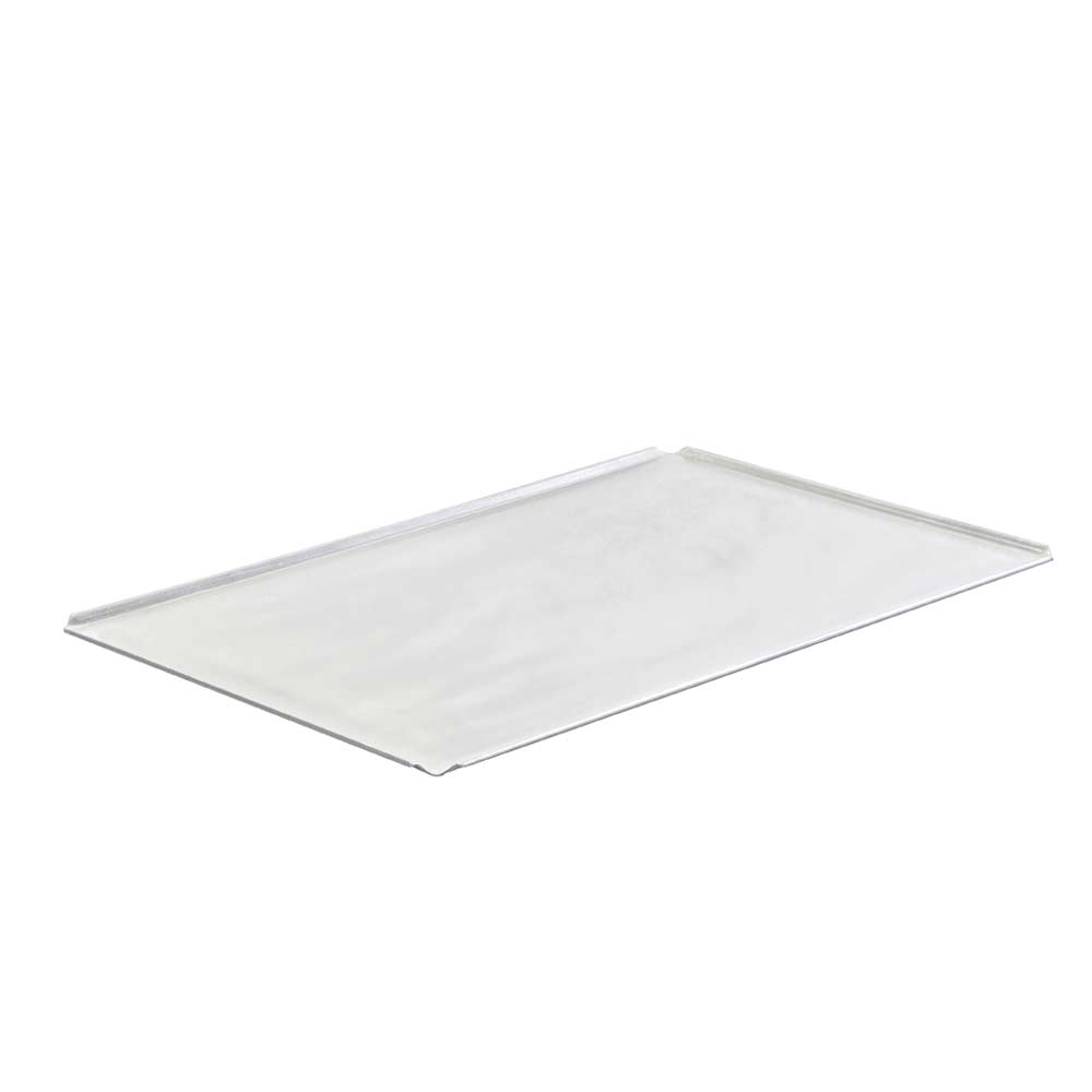 Glatte Backbleche aus reinem Aluminium. Gastronorm-Maß 53 x 32,5 cm mit Rändern 45°, Bäckernorm-Maß mit Rändern 90°.