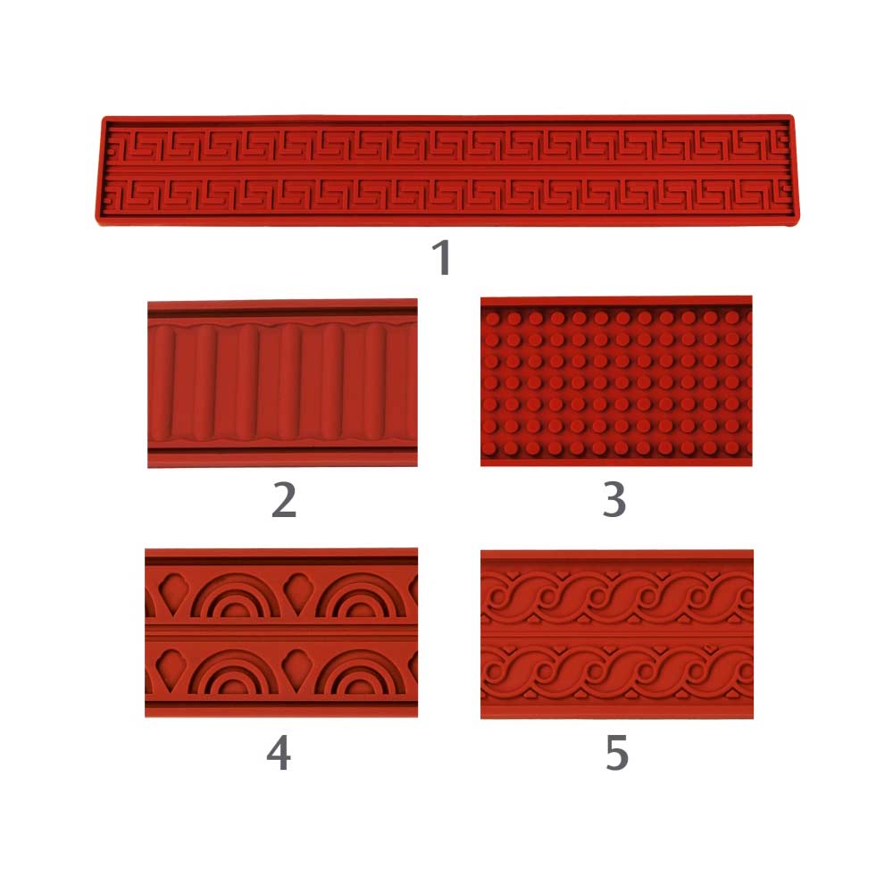 Backreliefmatte "Mäander/Greek" aus rotem Silikon. Klassische Friese für den Tortenrand und für das Blech. Die Backreliefmatte ist 60 x 8 cm groß.