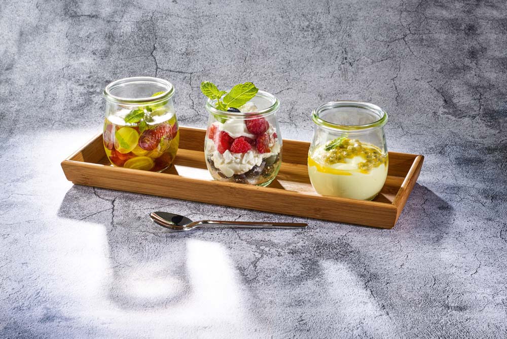 Schöne Bambus-Tabletts für die stilvolle Präsentation von Brot und Dips, Vorspeisen- und Dessertvariationen sowie Tapas.