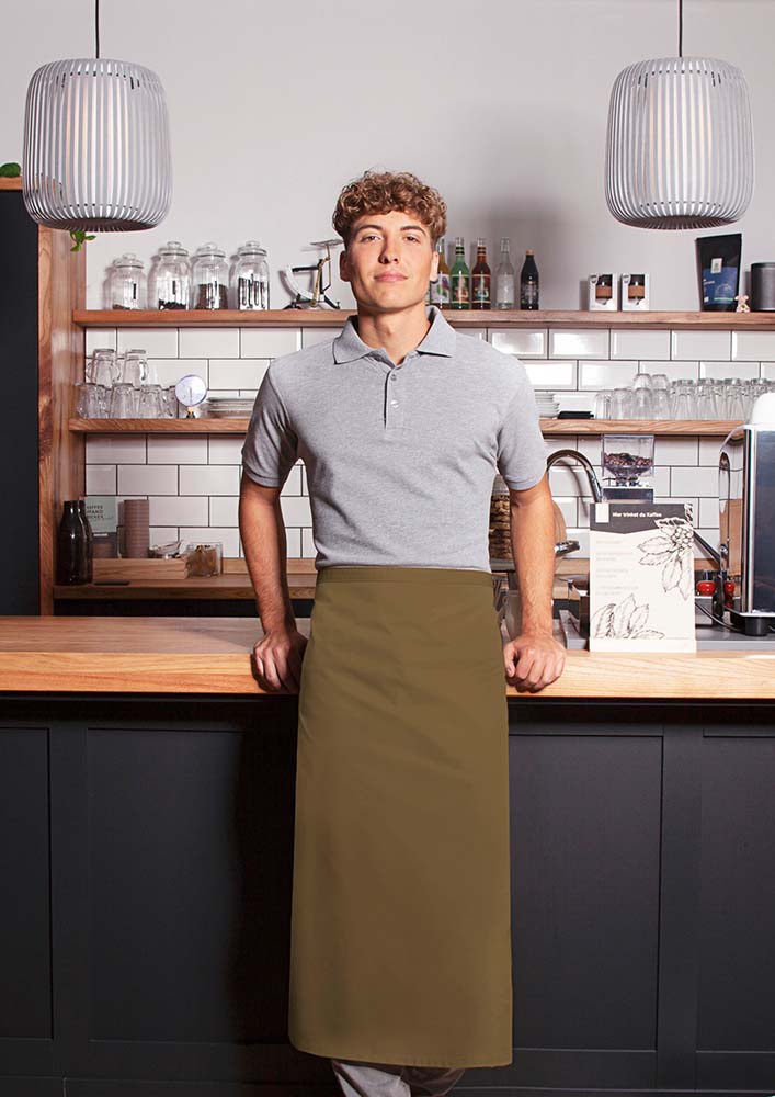 Bistroschürze aus Mischgewebe (65% Polyester / 35 % Baumwolle) mit durchgehendem Band aus Schürzenstoff und Nahtsicherung. Zertifiziert und geprüft gemäß STANDARD 100 by OEKO-TEX®. · Material: 65% Polyester, 35% Baumwolle (215 g/m²) · Größe 100 x 75 cm · Normalwaschgang bis max. 60 °C, mäßig heiß bügeln bis max. 150° C (Dampf erlaubt), nicht bleichen oder im Wäschetrockner trocknen. Professionelle Trockenreinigung möglich
