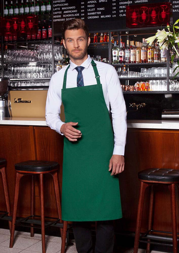 Latzschürze mit Schnalle der Serie "Basic". Latzband aus Schürzenstoff, mit Nahtsicherung, mit Schnalle zum stufenlosen Einstellen der Länge bis 70 cm. Zertifiziert und geprüft gemäß STANDARD 100 by OEKO-TEX®. · Material: 65% Polyester, 35% Baumwolle (215 g/m²) · Größe 75 x 90 cm · Normalwaschgang bis max. 60 °C, mäßig heiß bügeln bis max. 150° C (Dampf erlaubt), nicht bleichen oder im Wäschetrockner trocknen. Professionelle Trockenreinigung möglich