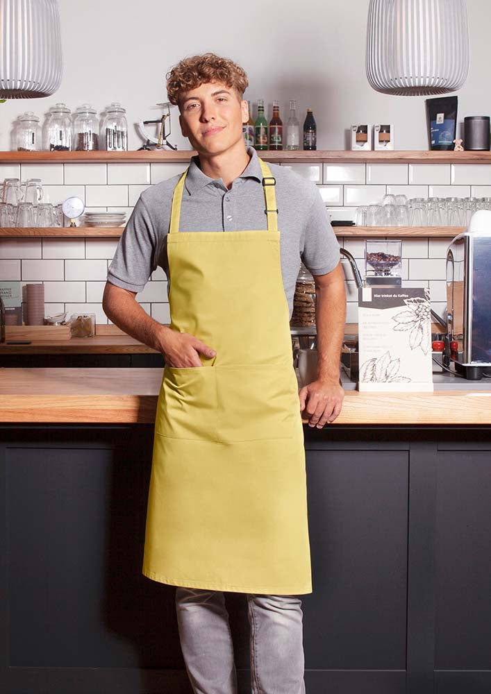 Latzschürze der Serie "Basic" mit Schnalle und Tasche. Bänder aus Schürzenstoff - zusätzliche Strapazierfähigkeit durch Nahtsicherung an den Schürzenbändern. Die Latzbandlänge kann einfach und flexibel durch eine Schnalle eingestellt werden (Länge bis 70 cm). Mit aufgesetzter Tasche mit zwei Fächern (40 x 20 cm). Zertifiziert und geprüft gemäß STANDARD 100 by OEKO-TEX®. · Material: 65% Polyester, 35% Baumwolle (215 g/m²) · Größe 75 x 90 cm · Normalwaschgang bis max. 60 °C, mäßig heiß bügeln bis max. 150° C (Dampf erlaubt), nicht bleichen oder im Wäschetrockner trocknen. Professionelle Trockenreinigung möglich