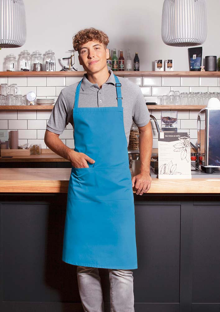 Latzschürze der Serie "Basic" mit Schnalle und Tasche. Bänder aus Schürzenstoff - zusätzliche Strapazierfähigkeit durch Nahtsicherung an den Schürzenbändern. Die Latzbandlänge kann einfach und flexibel durch eine Schnalle eingestellt werden (Länge bis 70 cm). Mit aufgesetzter Tasche mit zwei Fächern (40 x 20 cm). Zertifiziert und geprüft gemäß STANDARD 100 by OEKO-TEX®. · Material: 65% Polyester, 35% Baumwolle (215 g/m²) · Größe 75 x 90 cm · Normalwaschgang bis max. 60 °C, mäßig heiß bügeln bis max. 150° C (Dampf erlaubt), nicht bleichen oder im Wäschetrockner trocknen. Professionelle Trockenreinigung möglich