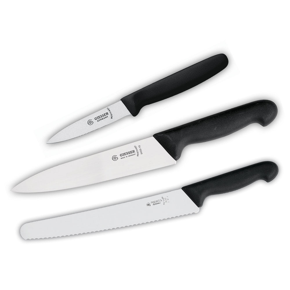 Drei Qualitätsmesser mit rutschsicheren schwarzen Kunststoff-Griffen: Gemüsemesser 8 cm + schmales Kochmesser 18 cm + Universalmesser mit Wellenschliff 25 cm.