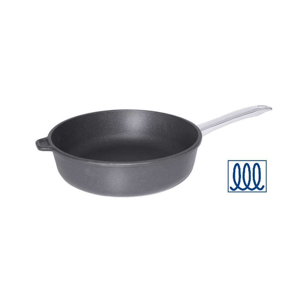 Bratpfanne aus handgegossenem Aluminium-Kokillenguss. Antihaftbeschichtung aus Titan-Aluminiumoxyd-Plasma. Backofenfest bis +250°C, mit Stiel aus Edelstahl 18/10. Ein absolut ochwertiges Qualitätsprodukt. Der Pfannendurchmesser beträgt 28 cm und die Höhe liegt bei 7 cm.
