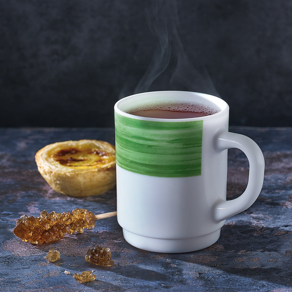 Der Henkelbecher Brush Green fasst 25 cl bei den Maßen Ø 6,8 x 9 cm. Er eignet sich vor allem für wärmende Getränke wie Tee, Kakao oder einen großen Kaffee. Das Opalglasgeschirr ist widerstandsfähiger und 3 Mal schockbeständiger als Porzellan. Somit ist es robust, langlebig und besonders für Bereiche mit hoher Beanspruchung geeignet. Die Henkelbecher sind stapelbar und spülmaschinengeeignet.