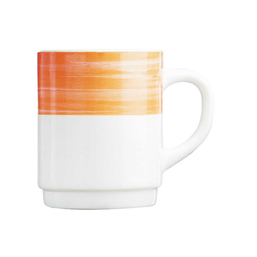 Der Henkelbecher Brush Orange fasst 25 cl bei den Maßen Ø 6,8 x 9 cm. Er eignet sich vor allem für wärmende Getränke wie Tee, Kakao oder einen großen Kaffee. Das Opalglasgeschirr ist widerstandsfähiger und 3 Mal schockbeständiger als Porzellan. Somit ist es robust, langlebig und besonders für Bereiche mit hoher Beanspruchung geeignet. Die Henkelbecher sind stapelbar und spülmaschinengeeignet.