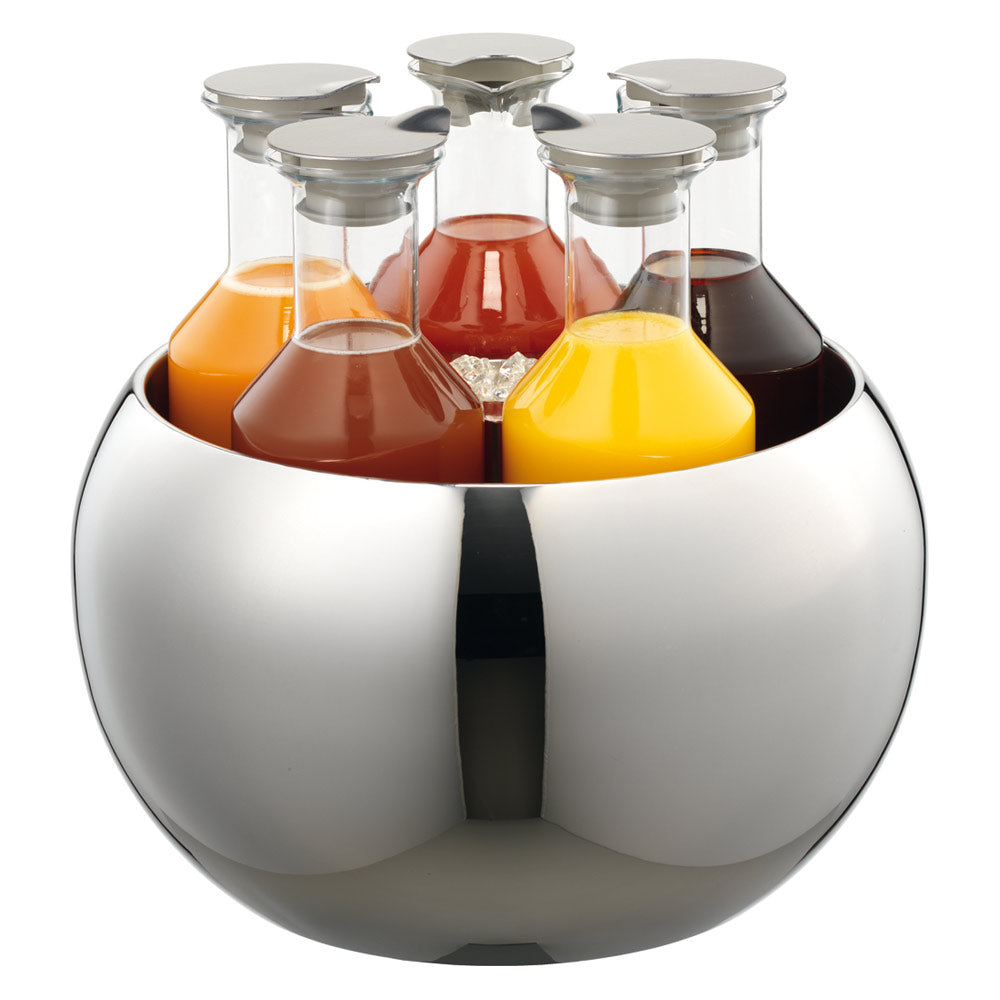 Der sehr elegante Flaschenkühler "Carafine" besteht aus einer Edelstahlkugel, doppelwandig mit Isolierung, einer Edelstahl-Crasheisröhre und 3 bzw. 5 Glaskaraffen. Zusätzliche Karaffen für einen schnellen Wechsel sind separat erhältlich. Lieferzeit ca. 1 Woche.