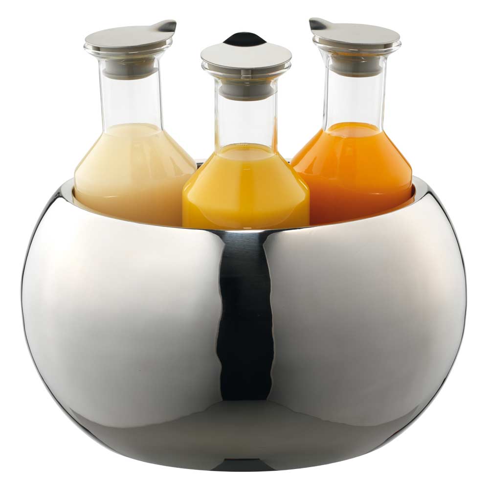Der sehr elegante Flaschenkühler "Carafine" besteht aus einer Edelstahlkugel, doppelwandig mit Isolierung, einer Edelstahl-Crasheisröhre und 3 bzw. 5 Glaskaraffen. Zusätzliche Karaffen für einen schnellen Wechsel sind separat erhältlich. Lieferzeit ca. 1 Woche.