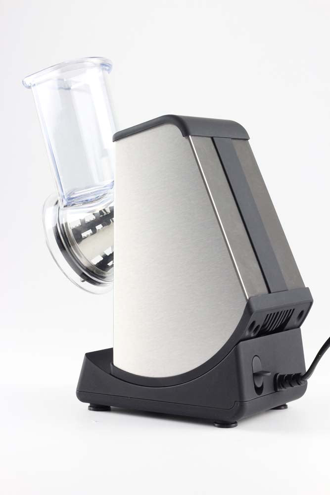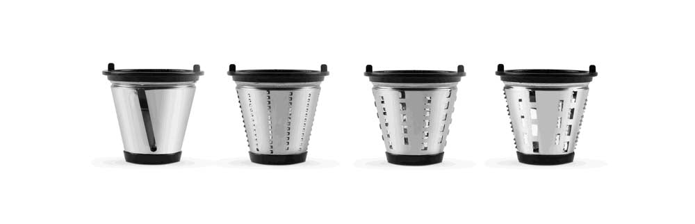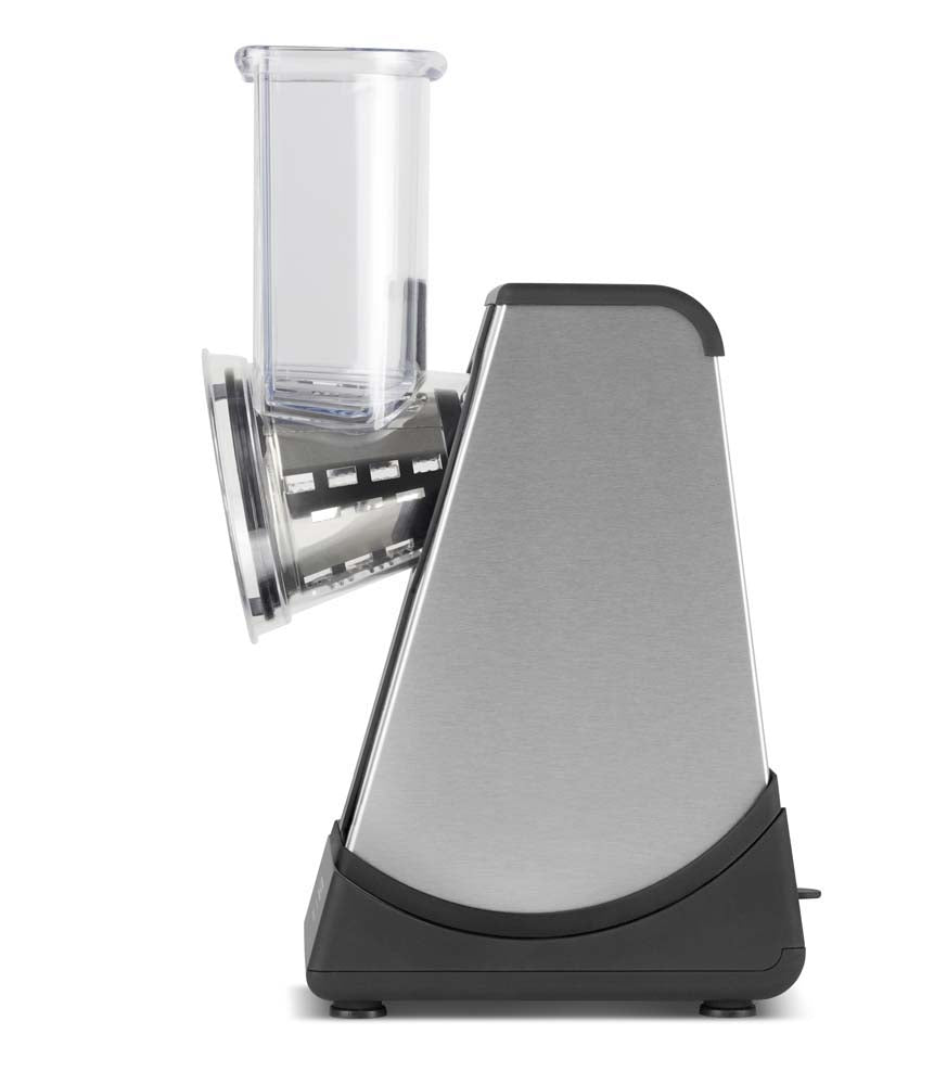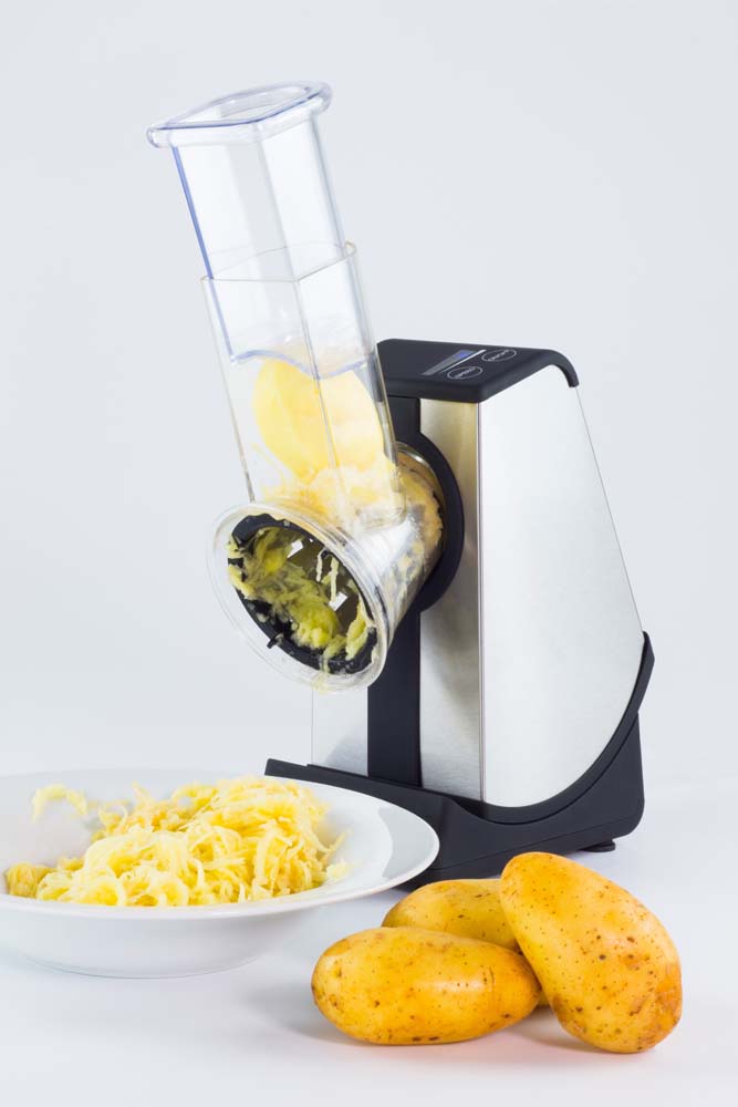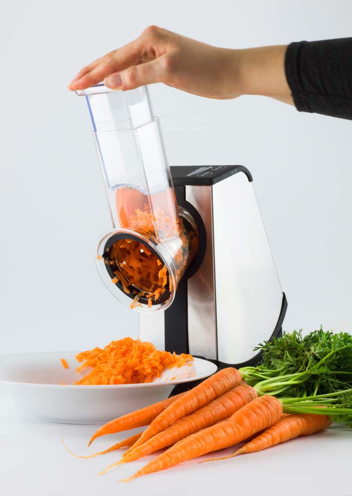 Zum Schneiden, Reiben und Raspeln von Karotten, Kartoffeln, Käse und vielem mehr. Vier austauschbare Reibetrommeln mit extra scharfen acid etched" Klingen für Scheiben, große Julienne, kleine Julienne und Raspeleinsatz. Die konische Form der Einsätze ermöglicht es das Reibgut leichter zu transportieren und der Kippmodus bietet Ihnen freie Wahl des Arbeitswinkels. Das Bedienfeld ist mit einer Soft-Touch Oberfläche ausgestattet. Zudem verfügt das Gerät über 5 Geschwindigkeitsstufen und eine 3 - sekündige Sicherheitsverzögerung beim Einschalten.