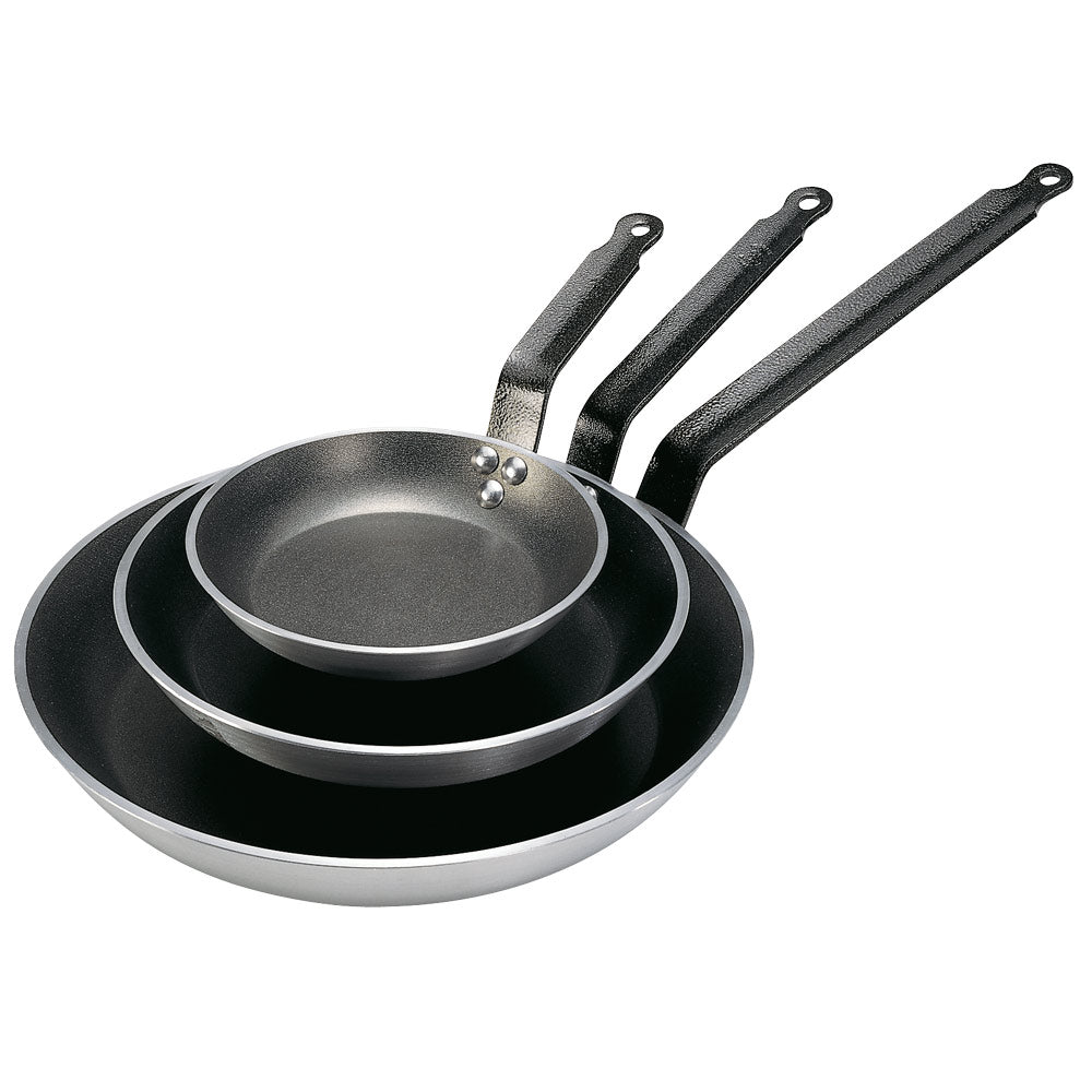 Lyoner Form aus gezogenem Aluminium mit stabil vernietetem Flachstiel. Innen mit widerstandsfähiger Antihaftbeschichtung, außen blank. Gute Wärmeleitung durch bis zu 5 mm Materialstärke. Geeignet für alle Herdarten - außer Induktion.