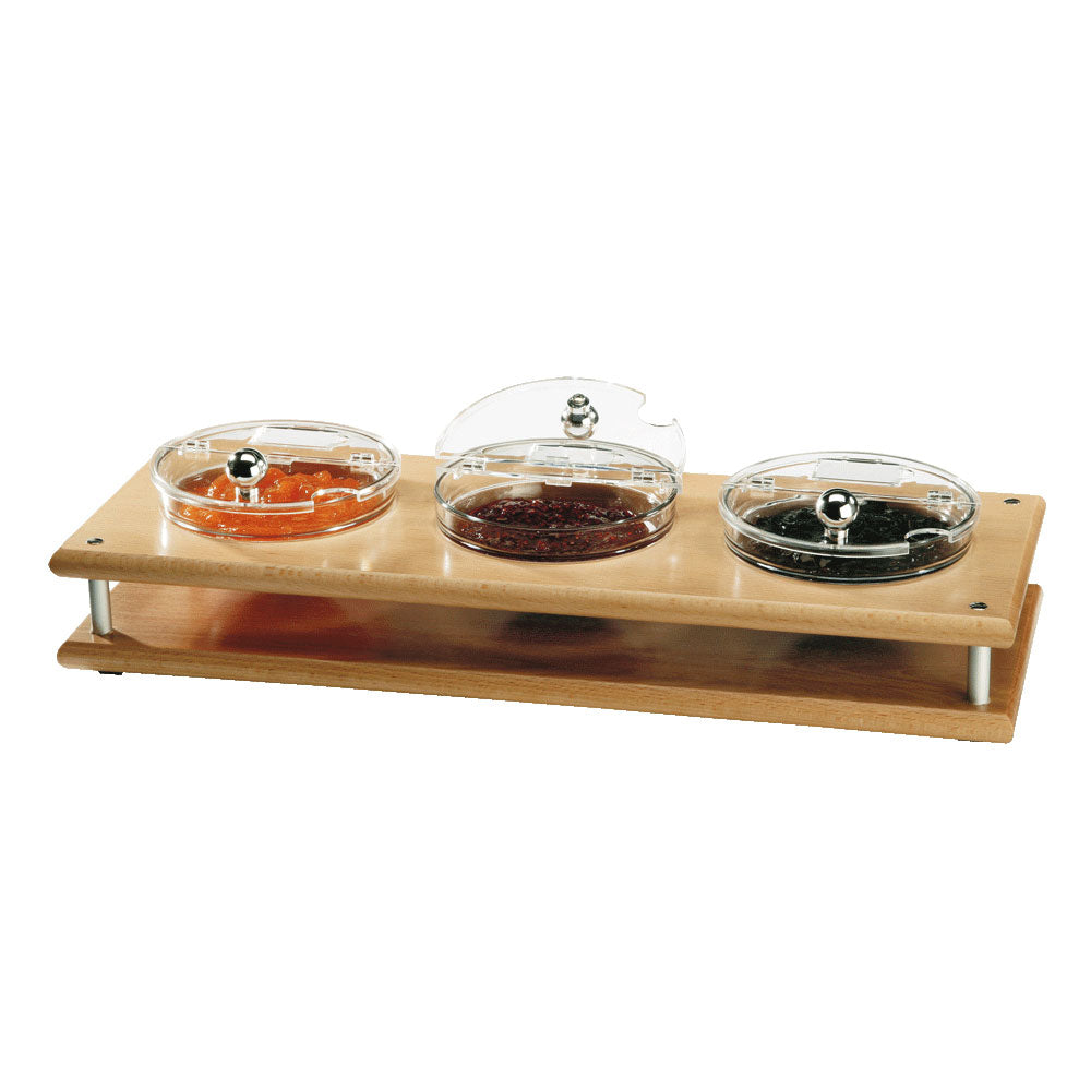 Praktische selbstbeschriftbare Schilder erleichtern die Kennzeichnung der Inhalte ideal für den professionellen Einsatz in Gastronomie, Catering und Buffets. Der robuste Standfuß aus massivem Buchenholz sorgt für stabilen Halt und eine ansprechende Präsentation.