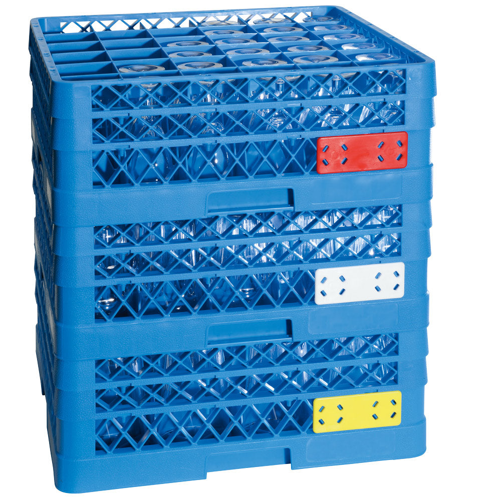 Ein Beispiel für mögliche Markierungen: kleine Weingläser in gelb markierten Kisten und Sektgläser in weiß markierten Kisten. Die Liefereinheit umfasst 1 Stück. Verschiedene Farben vorhanden.