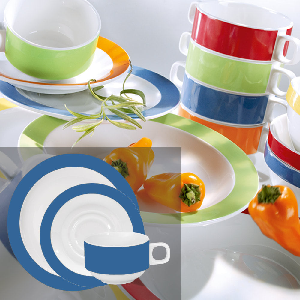 Farbenfrohes Systemgeschirr ideal für die Gemeinschaftsverpflegung mit verstärkten Kanten