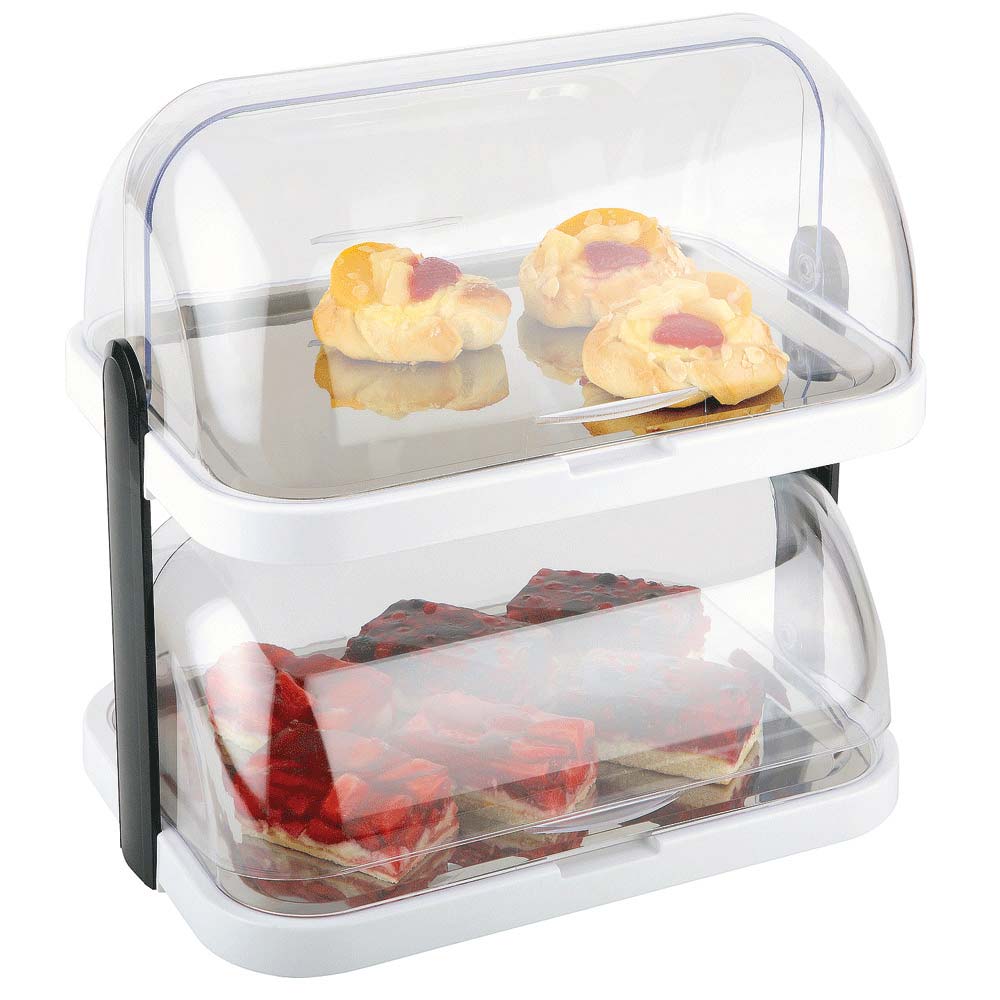Es sind zwei Edelstahl-Tabletts jeweils mit den Maßen 39 x 28 cm und dazugehörigem klaren Rolldeckel aus Plexiglas, die von beiden Seiten zu öffnen sind, enthalten. Der robuste Korpus der Vitrine besteht aus ABS-Kunststoff. Dieser kann in Einzelteile zerlegt werden und ist somit auch spülmaschinengeeignet. Es werden vier Kühlakkus mitgeliefert, die unter die Tabletts gelegt werden können.