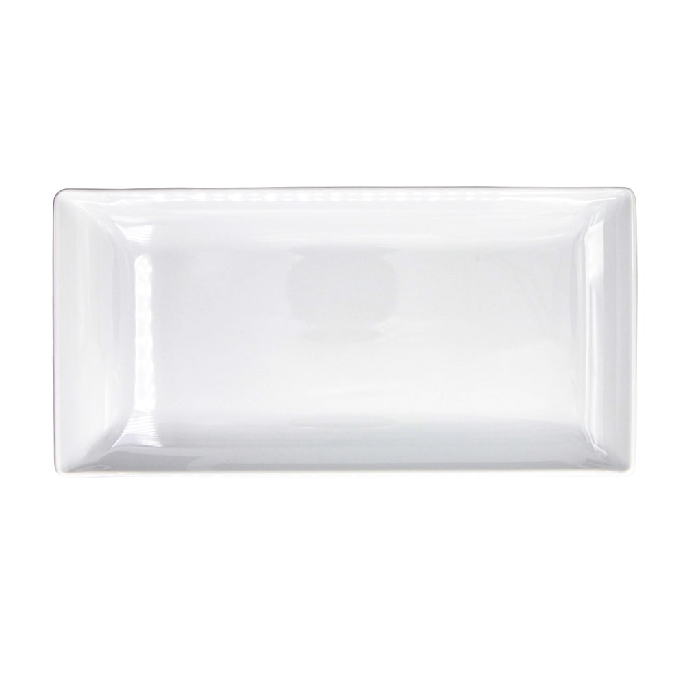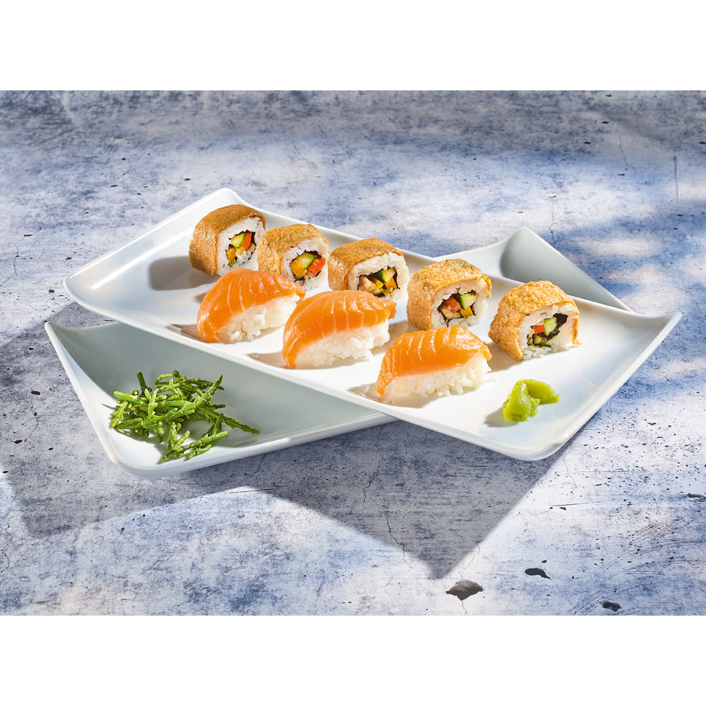Diese sanft geschwungene Asia-Platte ist aus reinweißem Hartporzellan gefertigt und ideal geeignet zur Präsentation von asiatisch inspirierten Beilagen oder Häppchen.