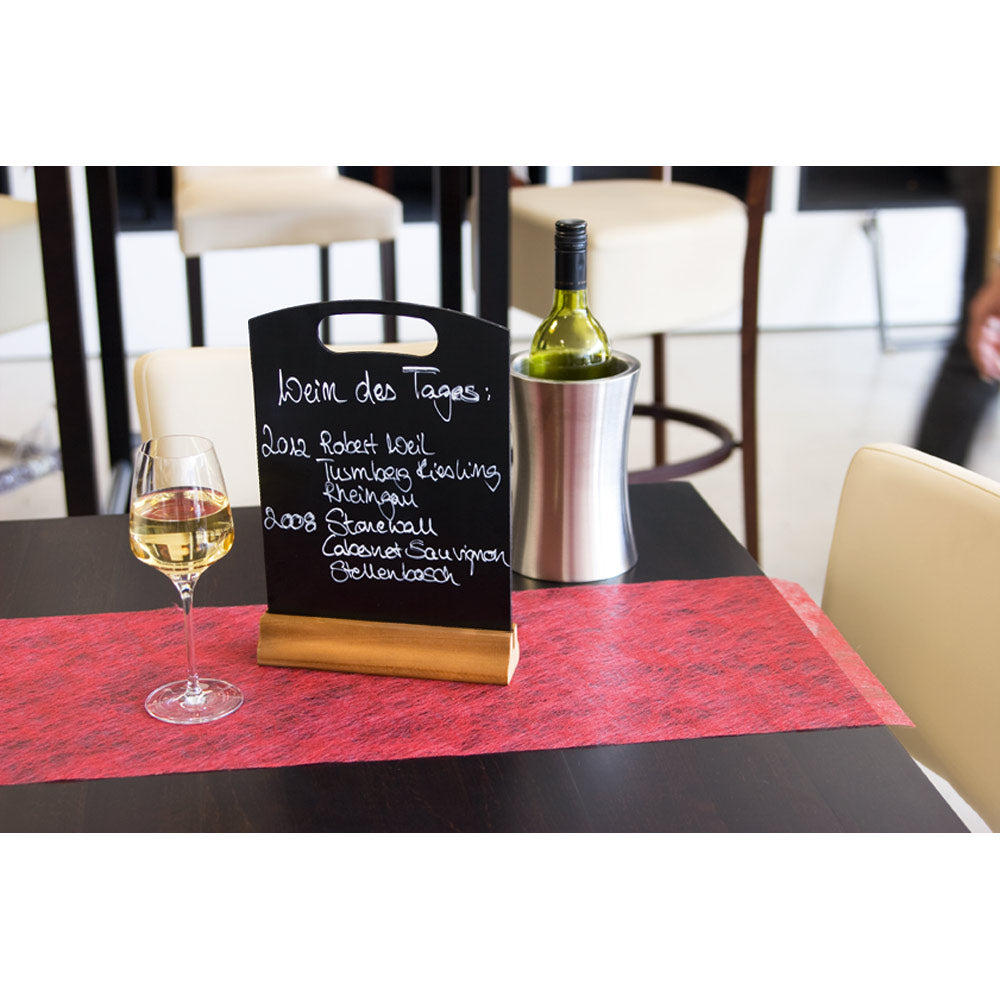 Preisgünstige Tischaufsteller. Kunststoffbeschichtete Schreibtafeln mit einem Holzfuß aus lackiertem Kiefernholz. Die Schreibtafeln können sowohl mit Kreidestiften, als auch mit normaler Kreide beschriftet werden.