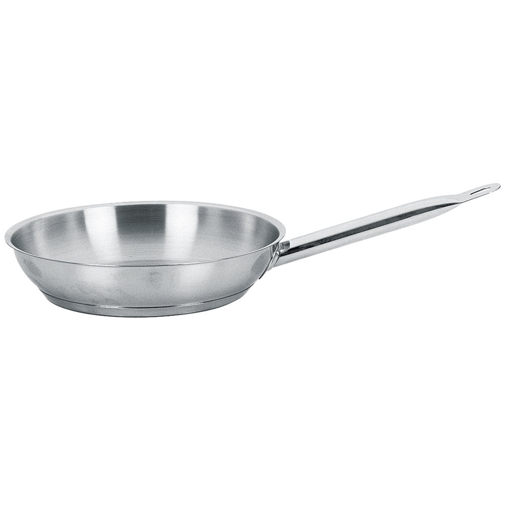 Robuste Pfannen aus rostfreiem Edelstahl 18/10. Innen matt gebürstet, außen hochglänzend poliert. Mehrfach punktgeschweißter Edelstahl-Rohrstiel. Gute Wärmeleitung und -speicherung durch soliden Sandwichboden mit 6 mm starkem Aluminiumkern (bis Ø 32 cm hygienisch verkapselt). Ab Ø 36 cm mit Gegengriff. Geeignet für alle Herdarten - auch Induktion.