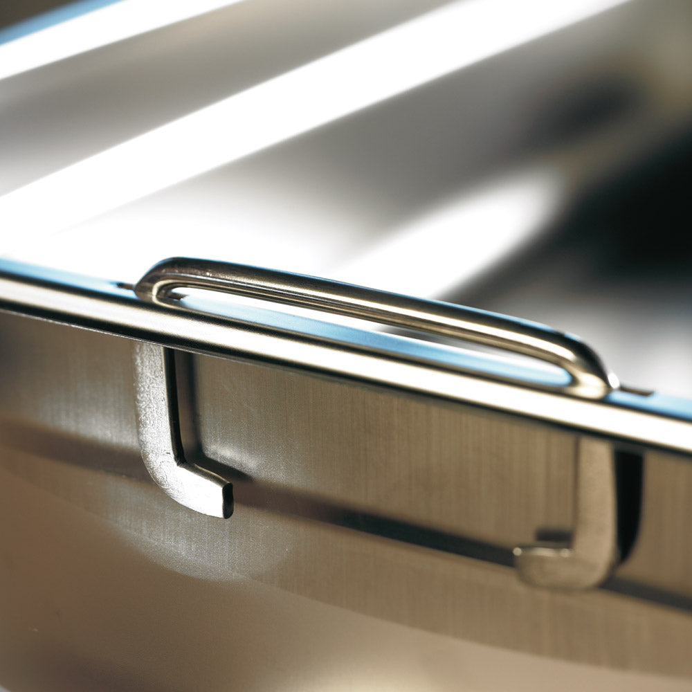 Speisenbehälter aus rostfreiem Edelstahl mit versenkbaren Griffen. Vereinfachen das Einsetzen, Entnehmen und Transportieren. Mittelschwere, stabile Qualität mit Stapelnocke. Hitzebeständig, langlebig und spülmaschinenfest.
