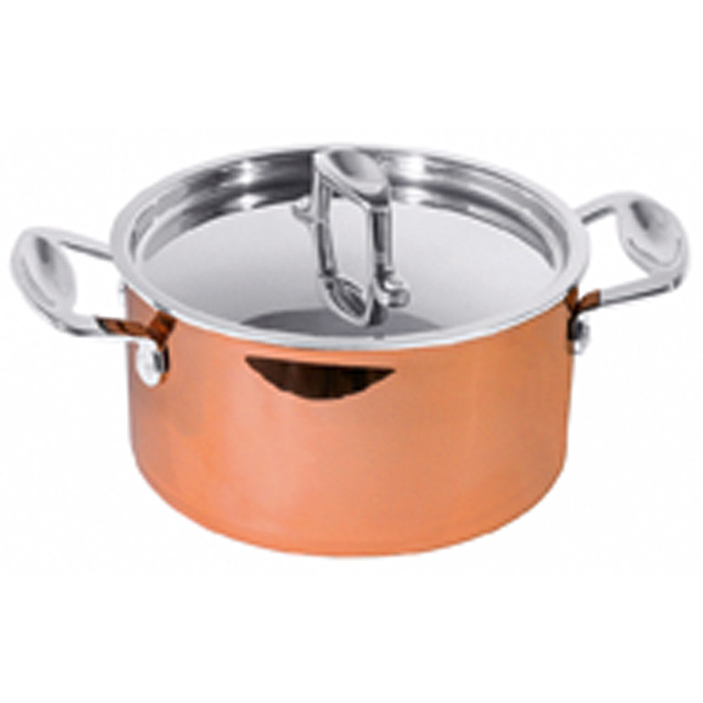 Kupfertopf mit zwei genieteten Griffen aus Chromnickelstahl 18/10. Lieferung erfolgt inklusive Deckel. Größe 20 x 11,5 cm - Inhalt 3,5 Liter. Kupfertöpfe und Kupferpfannen sind nicht nur besonders edel anzusehen, sie verfügen auch über die besten Wärmeeigenschaften. Die Hitze wird gleichmäßiger verteilt und lässt sich genauestens dosieren. Die Gefahr des Anbrennens wird damit minimiert, und es wird Energie gespart. Die Töpfe der Serie "Cuisine" sind ein besonders hochwertiges Kochgeschirr mit Schüttrand, bestehend aus einem 2,5 mm starken Mehrschichtenaufbau aus Chromnickelstahl 18/10, Aluminium und Kupfer. Geeignet für alle Herdarten - auch Induktion.