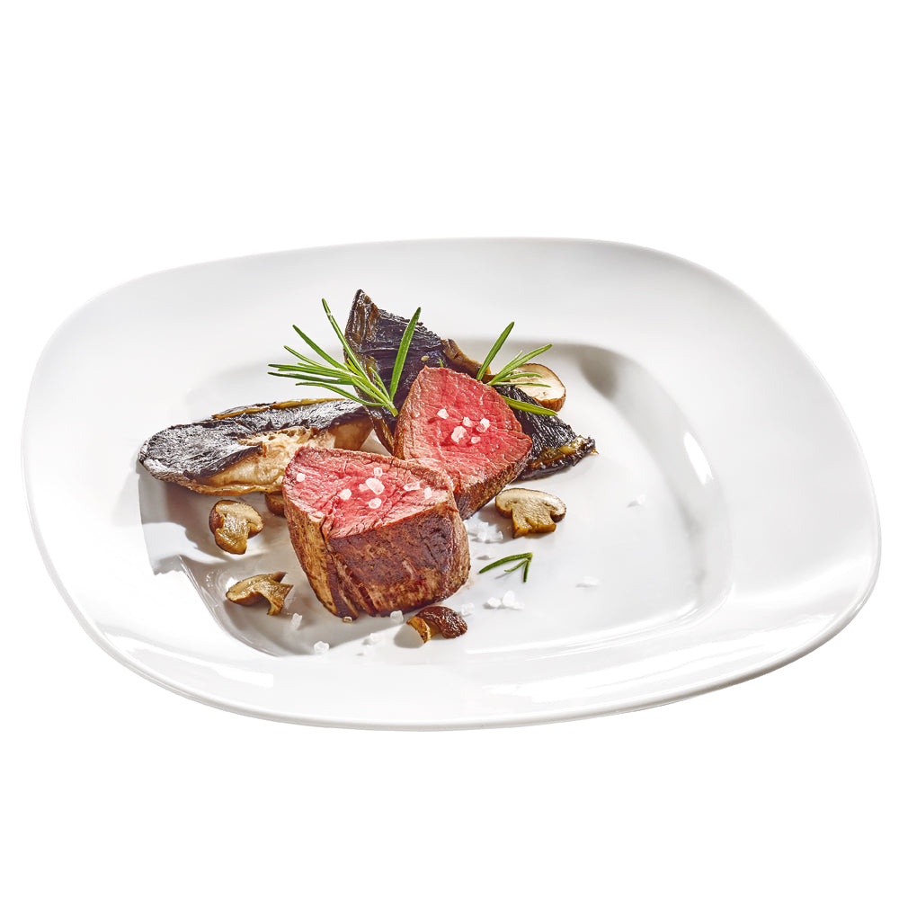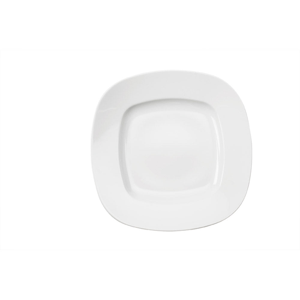 Viereckiger Teller aus reinweißem Hotelporzellan. Universell einsetzbar für eine Vielzahl an Speisen!