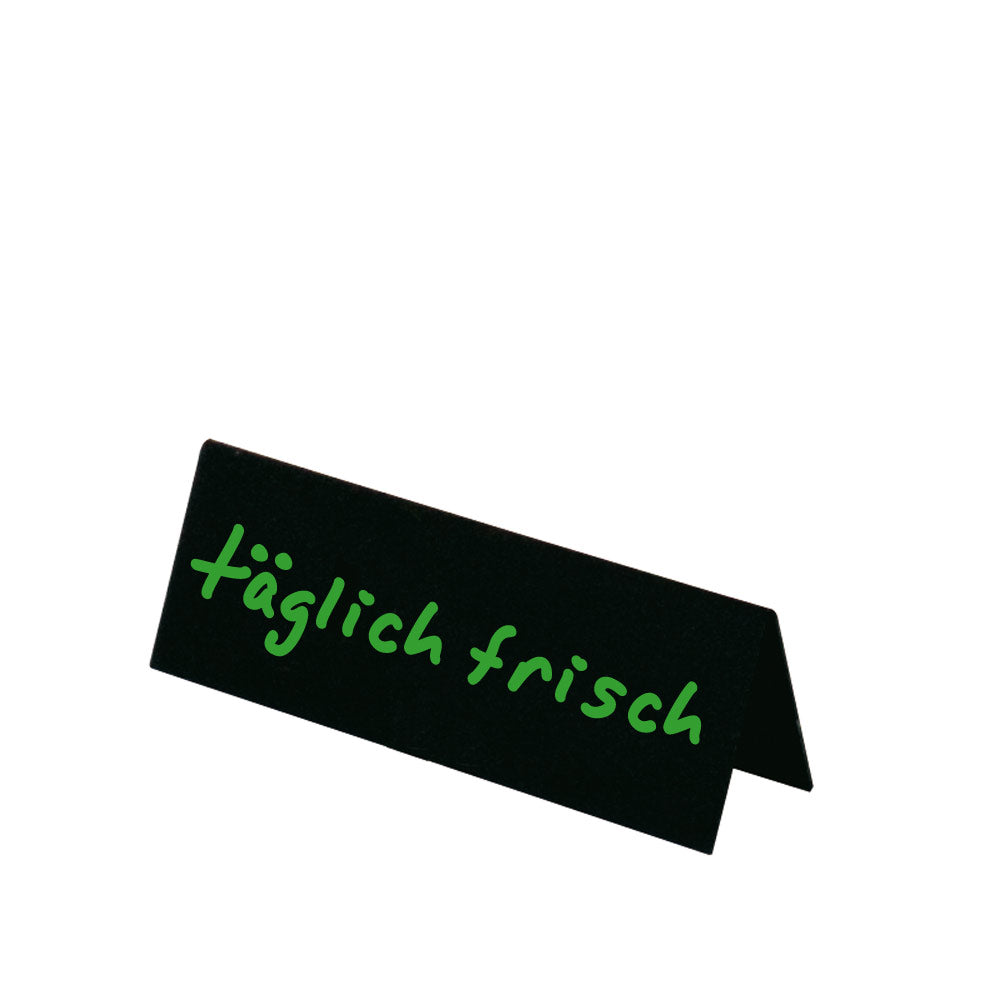 Die Kreidetafel im Format 10,5 x 3,5 cm ist ein besonders kompakter Dachaufsteller für Gastronomie, Buffets, Catering oder Events. Sie besteht aus widerstandsfähigem Kunststoff mit tafellackbeschichteter Oberfläche und lässt sich mit unseren Kreidestiften beschreiben und einfach feucht abwischen. Damit ist die Tafel wiederverwendbar und eine nachhaltige Lösung für den professionellen Einsatz.