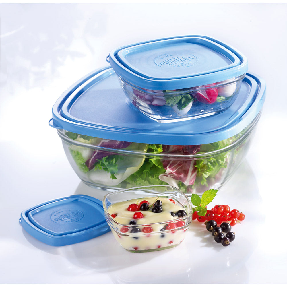 Universell einsetzbare Schüsseln aus gehärtetem Glas. Spülmaschinen- und mikrowellenfest. Für alle Größen sind passende Deckel aus blauem PE-Kunststoff lieferbar. Temperaturbeständig von -40° bis +95° C, ebenfalls spülmaschinen- und mikrowellenfest.