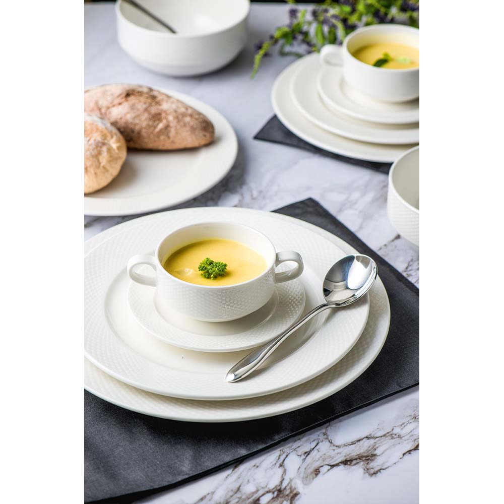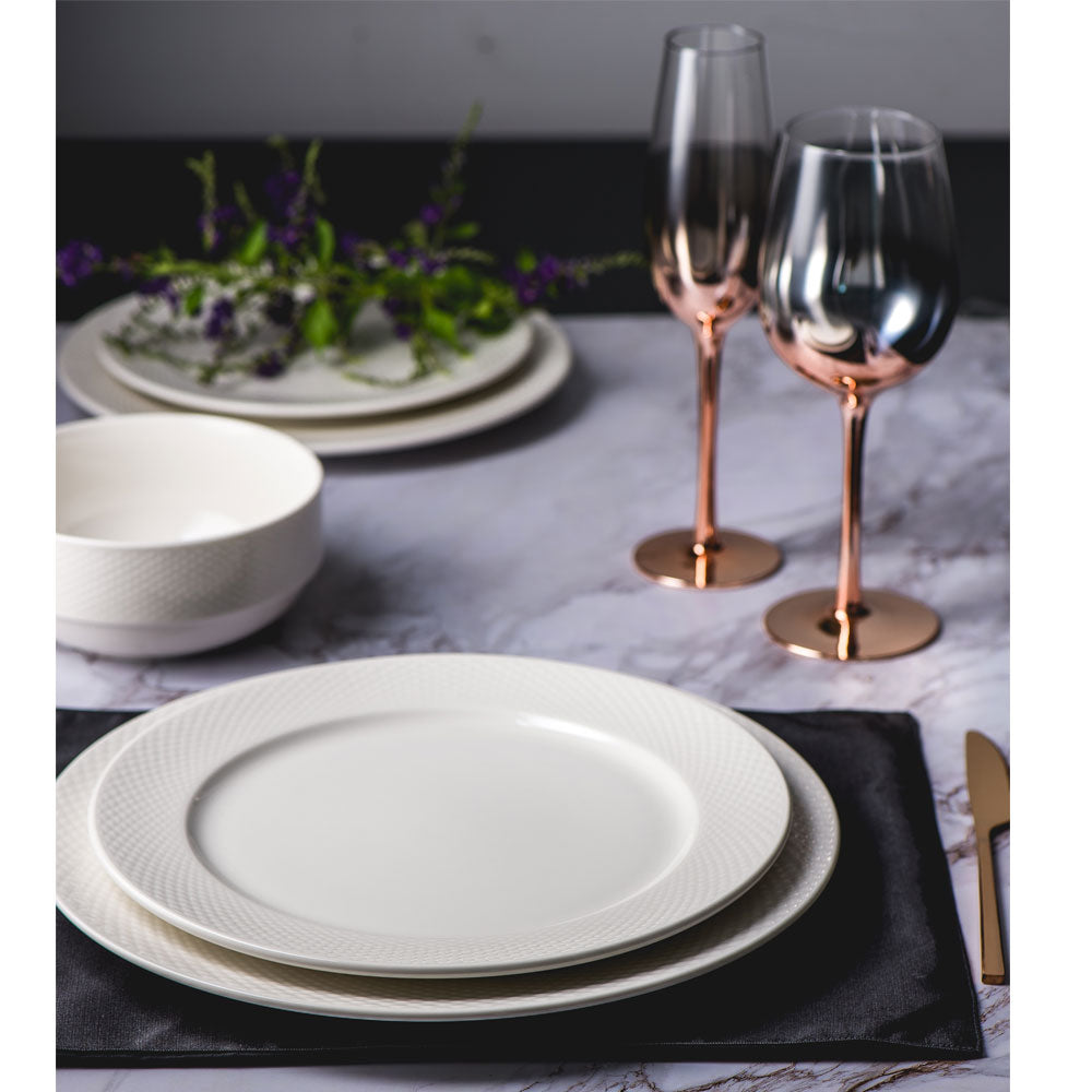 Werten Sie Ihr Tischgedeck auf durch eine dezent auffallende und zart dekorierte Serie aus Hartporzellan mit modernem Relief in Diamand-Optik.