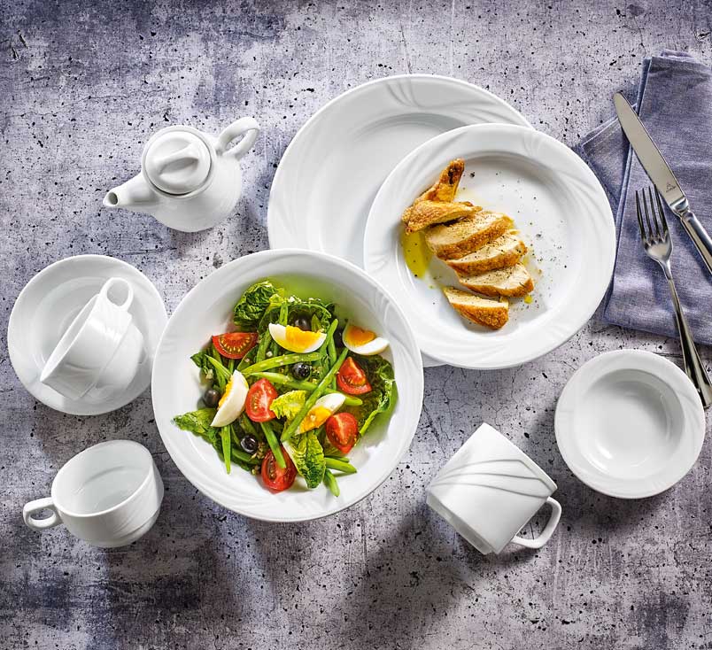 Die Reihe Diana zeichnet sich aus durch robustes und preiswertes Hotelporzellan in universellem Reinweiß mit zartem Reliefdesign.