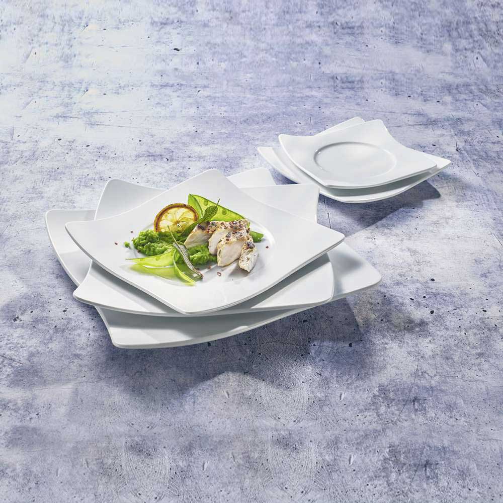 Die quadratische Tellerserie mit elegant geschwungener Fahne aus reinweißem Hartporzellan ist die perfekte Bühne für verschiedenste Speisen. Stapelbar, spülmaschinen- und mikrowellenfest.