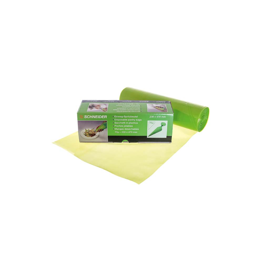 Einweg-Spritzbeutel aus doppelt extrudierter PE-Folie (70 µm) mit glatter Innenseite. Hohe Reißfestigkeit der Schweißnaht, mit oder ohne Tülle verwendbar. Lieferung auf Rolle in einem praktischen Spenderkarton.