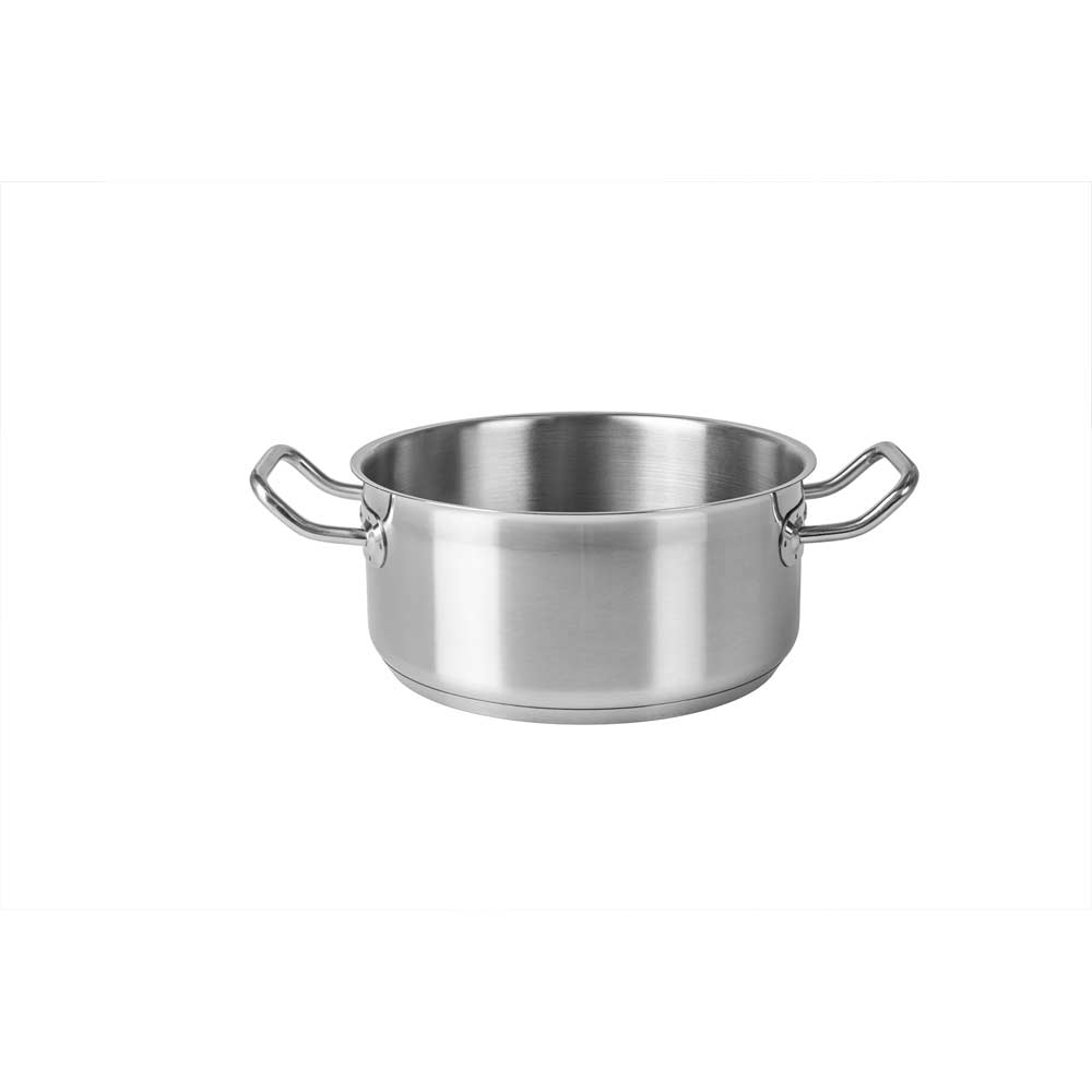 Der professionelle Topf besteht aus rostfreiem Chromnickelstahl 18/10 mit einer Materialstärke von 1,2 mm. Die Oberfläche ist matt gebürstet und der Bratentopf verfügt über punktverschweißte Griffe, welche die Wärme nicht annehmen und somit gefahrlos angefasst werden können. Der Sandwich-Boden verfügt über einen 3,6 mm starken Aluminiumkern, wodurch die Hitze länger gehalten wird und gleichmäßiger abgegeben wird, und ist hygienisch verkapselt.