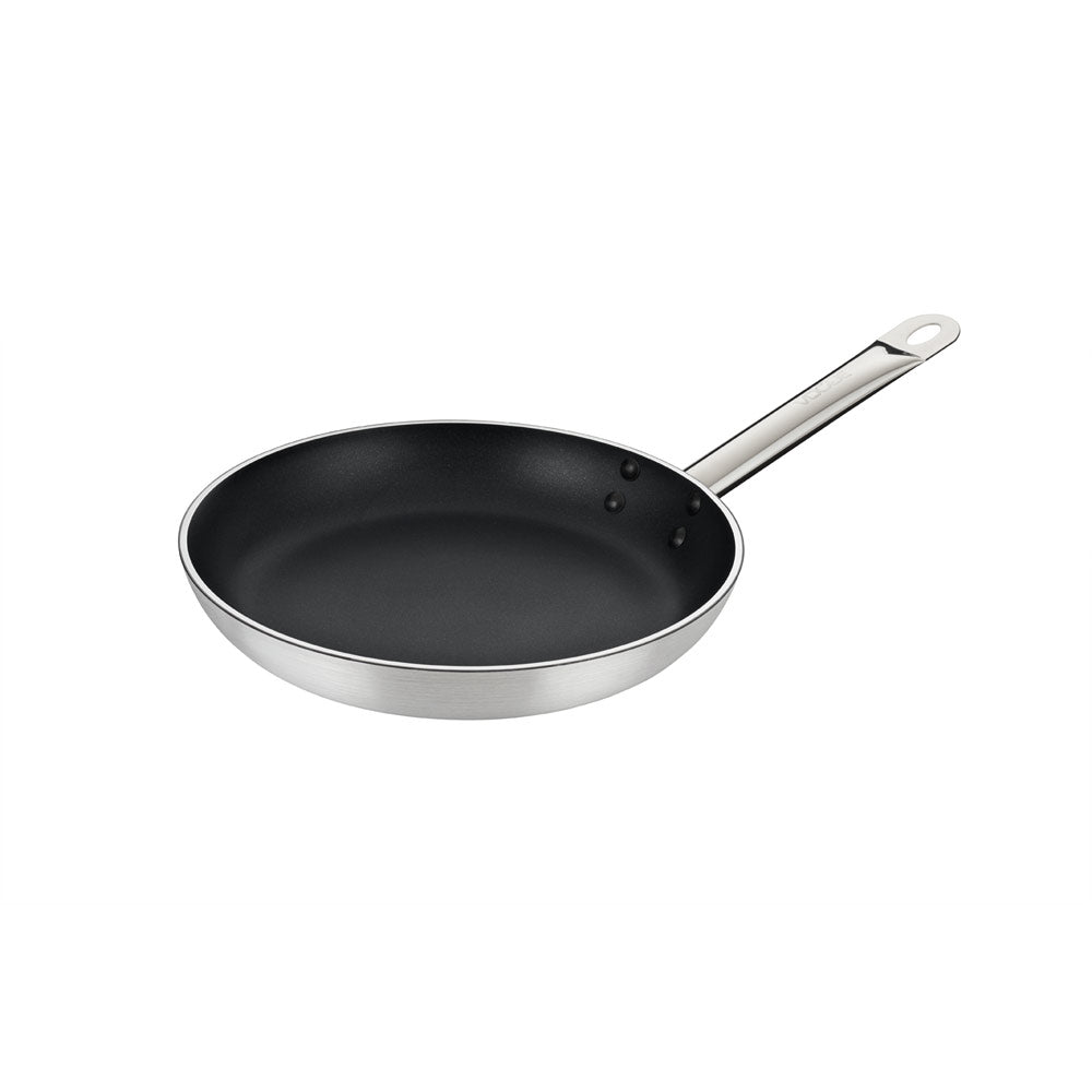 Induktionsbratpfanne aus Aluminium mit einer mehrfachen titanverstärkten QuanTanium-Antihaftbeschichtung und einem dreifach genieteten Hohlgriff. Der Boden hat eine zusätzliche Schicht aus Edelstahl. Geeignet für alle Herdarten - auch Induktion.