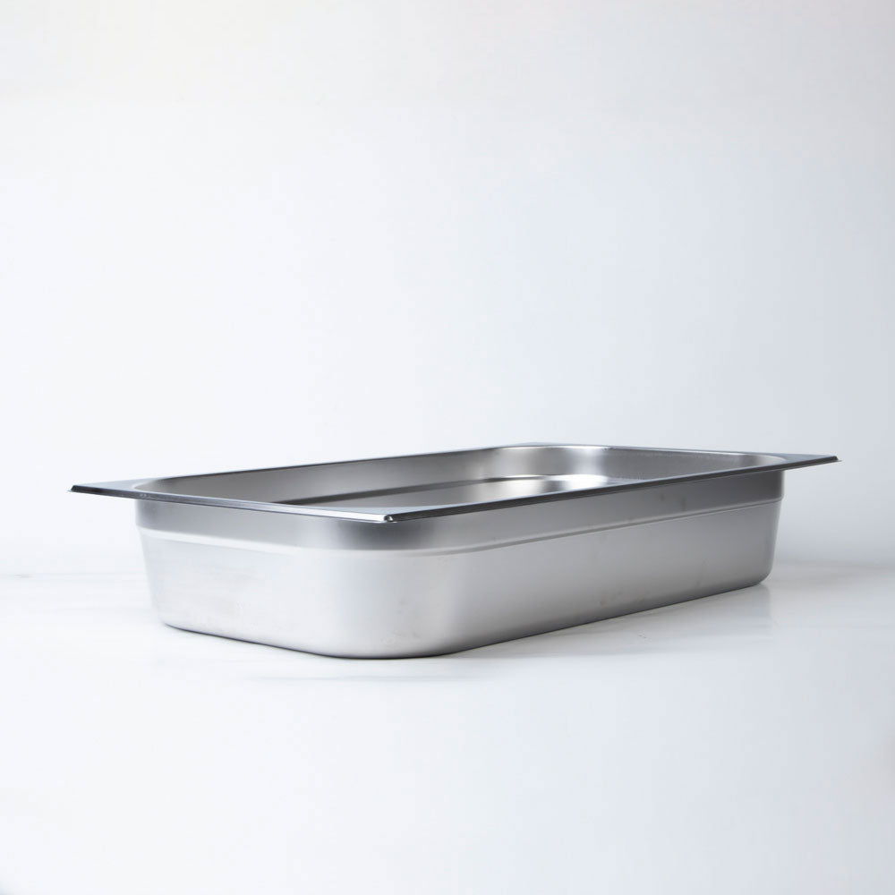 Gastronorm-Speisenbehälter der Serie ECO-Line aus rostfreiem Edelstahl in der Größe GN 1/1. Mit einer Tiefe von 100 mm und einem Volumen von 13,3 l ist es die mittlerer Ausführung.