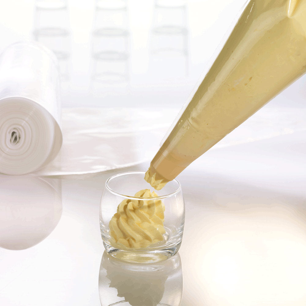 Die Einweg-Spritzbeutel haben eine Größe von 47 x 23 cm. Sie bestehen aus doppelt extrudierter PE-Kunststoff-Folie (75 µm) mit griffiger Außenseite und glatter Innenseite. Somit ist ein guter Halt und ein schnelles Ausdrücken möglich. Die Einweg-Spritzbeutel sind mit oder ohne Tülle verwendbar. Eine Abreißperforation lässt die einzelnen Beutel einfach trennen. Die Lieferung enthält 100 Stück auf einer Rolle in einem praktischen Spenderkarton. Sie bieten sich für Hotels und Restaurants mit Großküchen und auch für Konditoreien und Pâtisserien an.