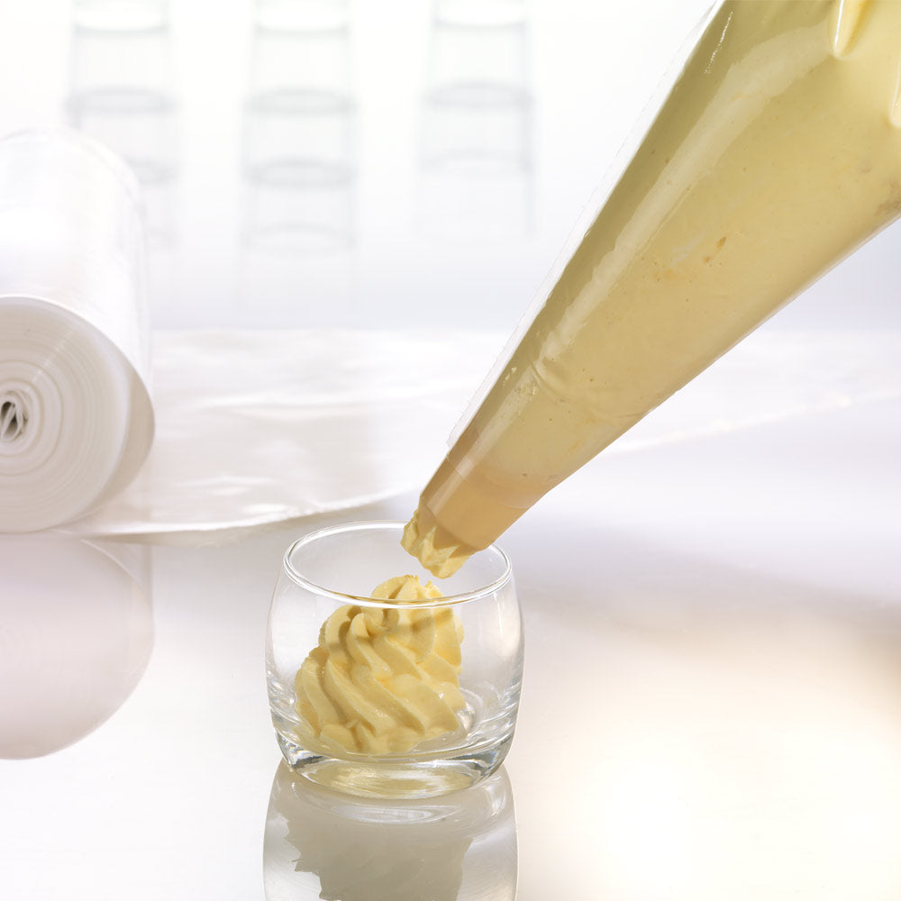 Die Einweg-Spritzbeutel haben eine Größe von 53 x 27 cm. Sie bestehen aus doppelt extrudierter PE-Kunststoff-Folie (75 µm) mit griffiger Außenseite und glatter Innenseite. Somit ist ein guter Halt und ein schnelles Ausdrücken möglich. Die Einweg-Spritzbeutel sind mit oder ohne Tülle verwendbar. Eine Abreißperforation lässt die einzelnen Beutel einfach trennen. Die Lieferung enthält 100 Stück auf einer Rolle in einem praktischen Spenderkarton. Sie bieten sich für Hotels und Restaurants mit Großküchen und auch für Konditoreien und Pâtisserien an.