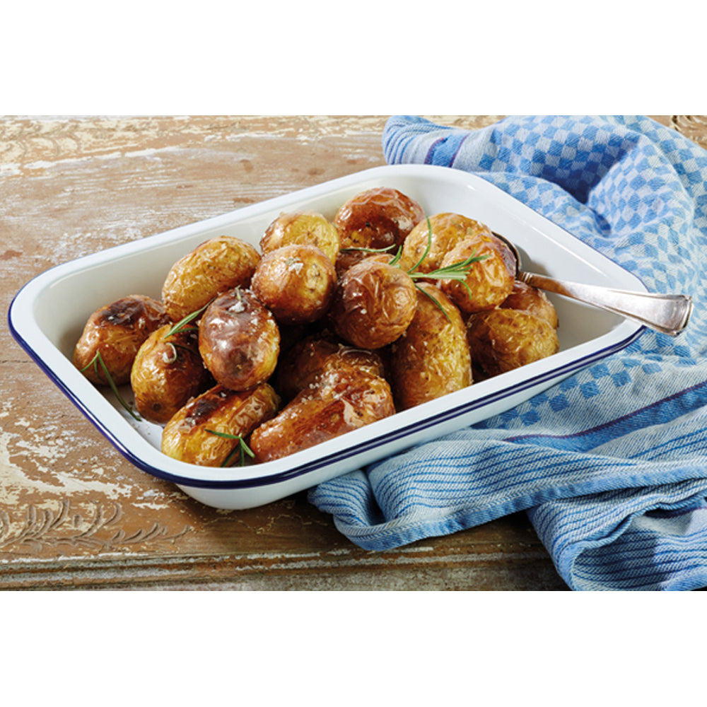 Absolut angesagtes Geschirr im Retro-Look mit dem ganz typischen dunkelblauen Rand. So wirken Ihre Speisen garantiert, als hätte Oma sie mit ganz viel Liebe zubereitet. Bei dem Material handelt es sich hierbei um spülmaschinenfestes, emailliertes Stahlblech. Das Besondere an der Emaille ist, dass es nicht nur ein korrosionsbeständiger, sondern auch geschmacksneutraler Überzug ist. Das Geschirr ist hitzebeständig bis 80° C und deswegen nicht für den Ofen geeignet.