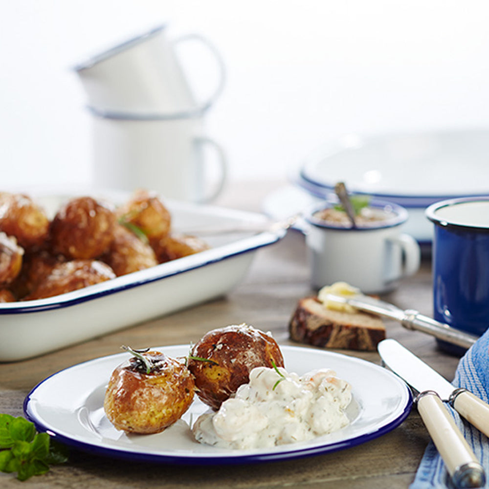 Absolut angesagtes Geschirr im Retro-Look mit dem ganz typischen dunkelblauen Rand. So wirken Ihre Speisen garantiert, als hätte Oma sie mit ganz viel Liebe zubereitet. Bei dem Material handelt es sich hierbei um spülmaschinenfestes, emailliertes Stahlblech. Das Besondere an der Emaille ist, dass es nicht nur ein korrosionsbeständiger, sondern auch geschmacksneutraler Überzug ist. Das Geschirr ist hitzebeständig bis 80° C und deswegen nicht für den Ofen geeignet.