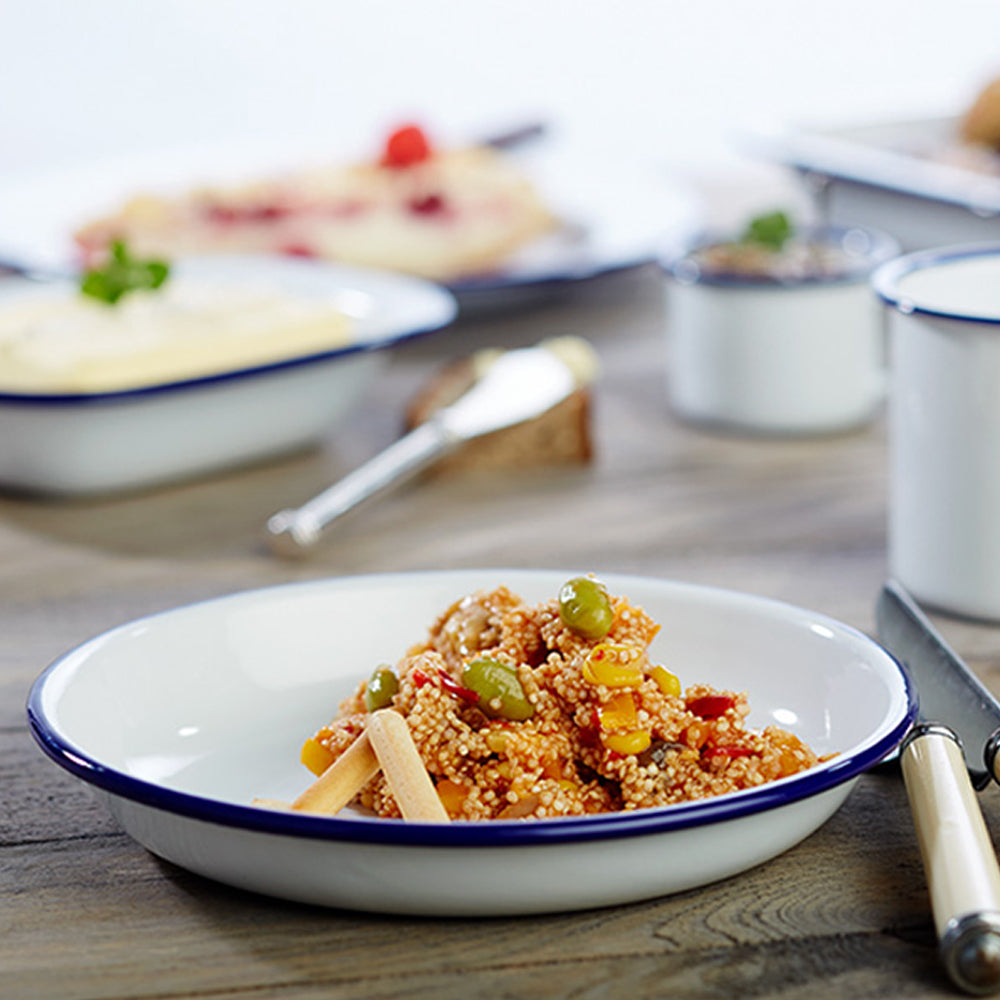 Absolut angesagtes Geschirr im Retro-Look mit dem ganz typischen dunkelblauen Rand. So wirken Ihre Speisen garantiert, als hätte Oma sie mit ganz viel Liebe zubereitet. Bei dem Material handelt es sich hierbei um spülmaschinenfestes, emailliertes Stahlblech. Das Besondere an der Emaille ist, dass es nicht nur ein korrosionsbeständiger, sondern auch geschmacksneutraler Überzug ist. Das Geschirr ist hitzebeständig bis 80° C und deswegen nicht für den Ofen geeignet.