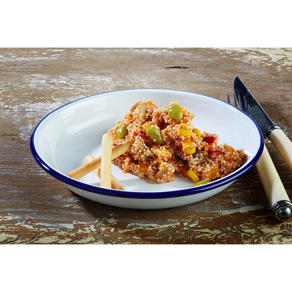 Der tiefe Teller Enamel hat einen Durchmesser von 18 cm und eine Höhe 3,5 cm. Er bietet sich hervorragend für Suppen und Pasta im Restaurant oder am Hotelbuffet an und sorgt für eine vertraute Atmosphäre.