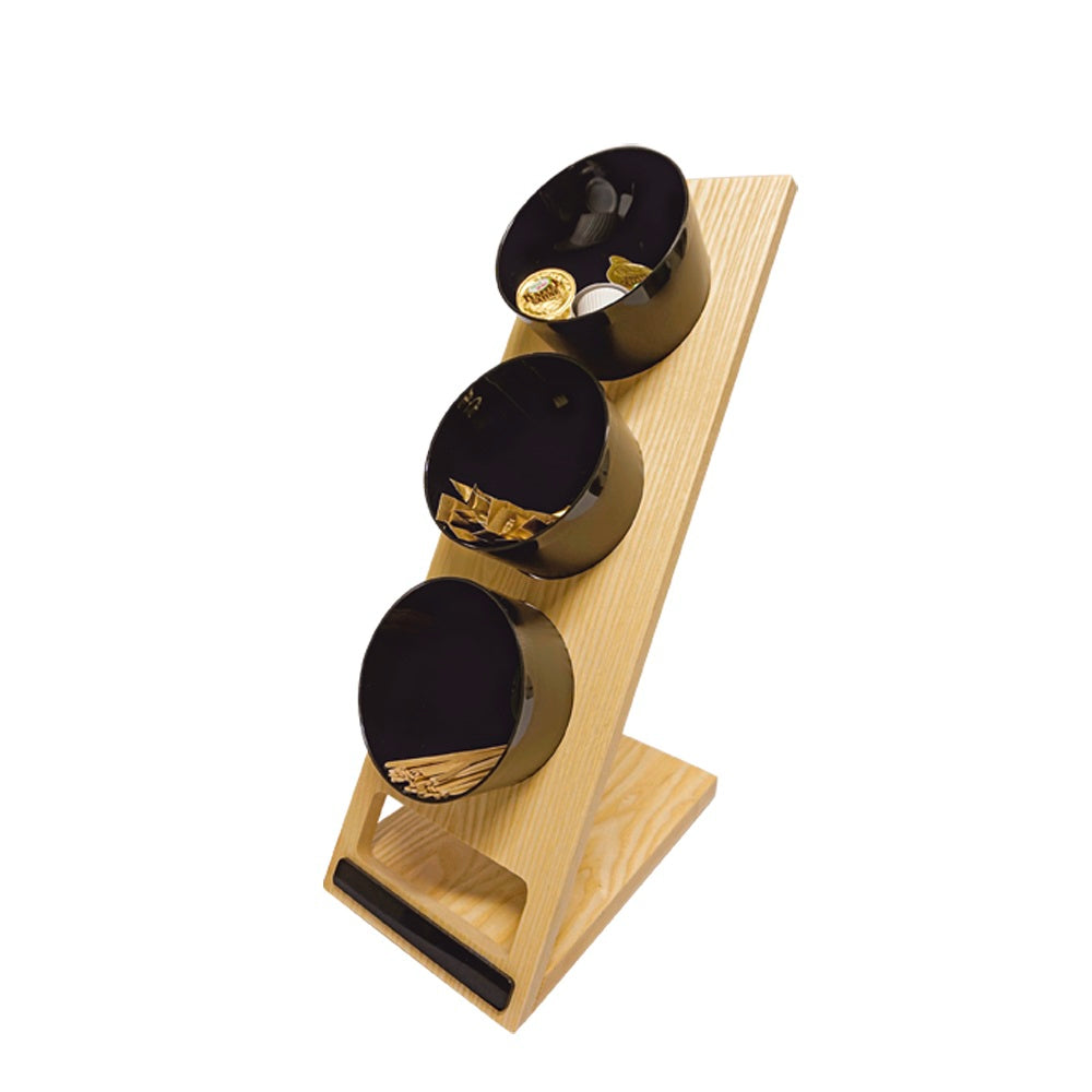 Elegante Präsentation von Kleinigkeiten am Buffet oder neben der Kaffeemaschine. Ob Portionspackungen Konfiture, Honig, Zucker oder Kondensmilch, auch leckere Dips oder Saucen für Salate, alles wird übersichtlich und ordentlich Ihren Gästen angeboten. Erhältlich in drei Farbtönen Esche hell, Nussbaum dunkel oder in Schwarz, jeweils 2-fach lackiert. Größe 18 x 28 x 49 cm.