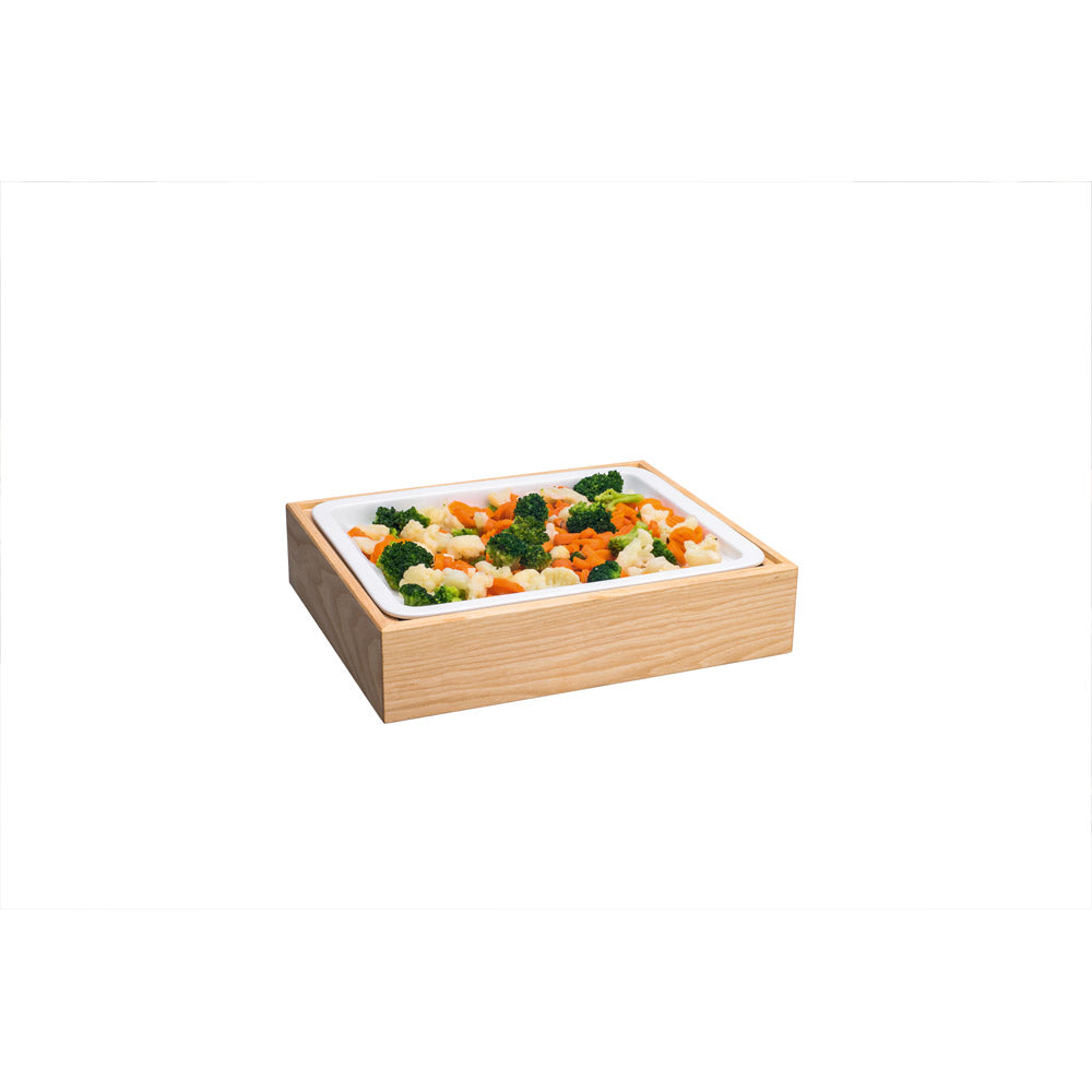 Stapelbare Rahmen aus geöltem Holz für das modulare Buffetsystem zur Aufnahme des Schneidbretteinsatzes, des Besteckkastens oder von GN-Tabletts bzw. -Behältern bis zu einer maximalen Tiefe von 65 mm.