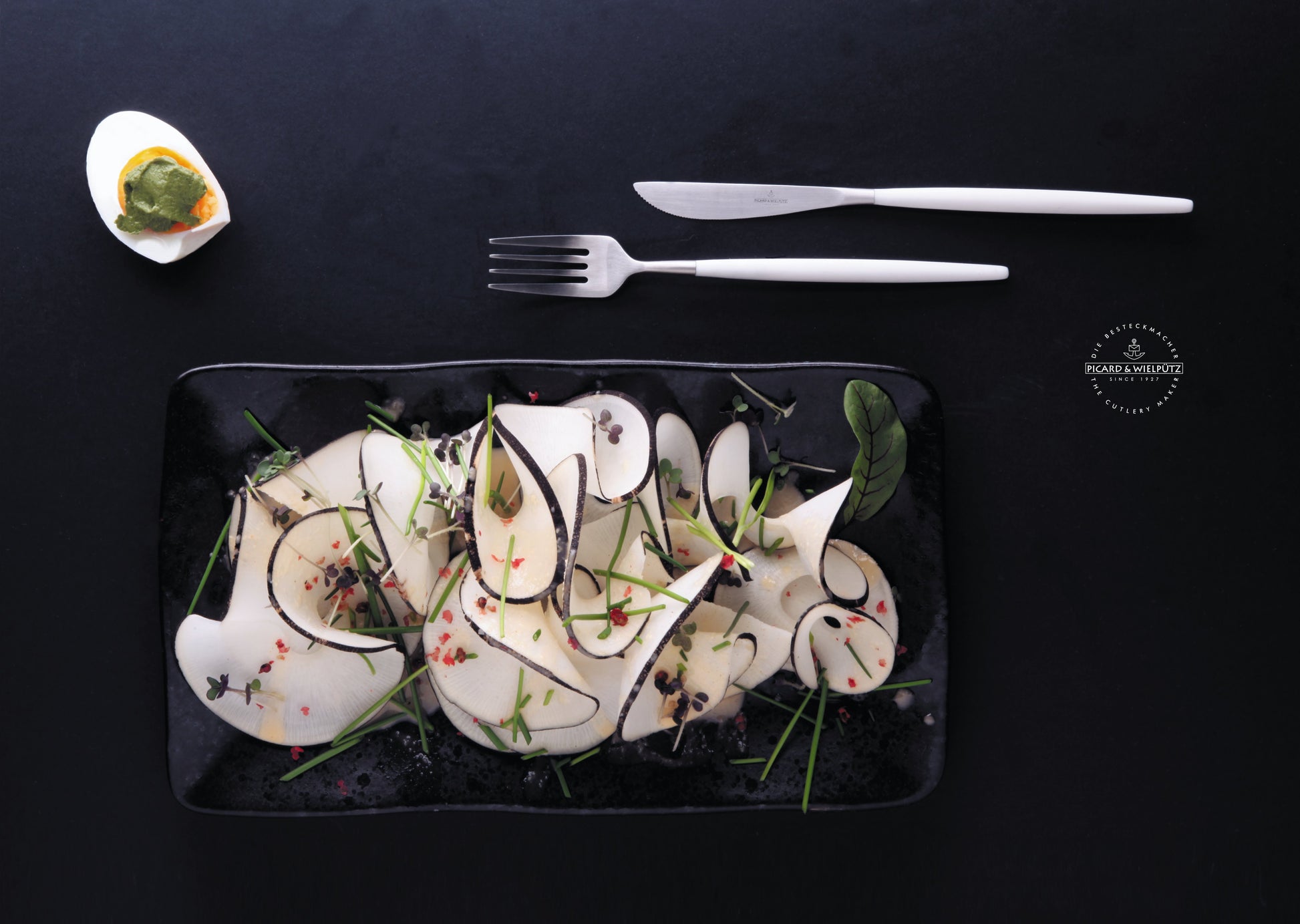 Die Besteckserie 6116 Franzi von Picard & Wielpütz überzeugt durch ein außergewöhnliches Design in Kombination mit einem spannenden Materialmix aus mattiertem 18/10 CNS (Messer aus Chromstahl) und dem hochwertigen Material POM am Griff. Die filigrane Formgebung, inspiriert von der zarten Blüte der Lotus Blume, verleiht dem Besteck eine besonders feine Eleganz. Zu den aktuell verfügbaren Grifffarben black und white sind jeweils folgende Teile erhältlich: Menümesser, Menügabel, Menülöffel, Kaffeelöffel, Kuchengabel, Dessertlöffel, Dessertgabel, Dessertmesser.